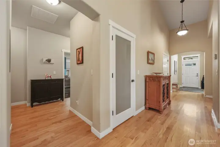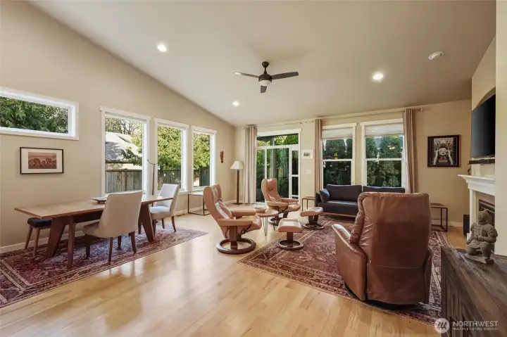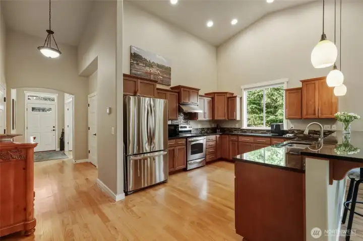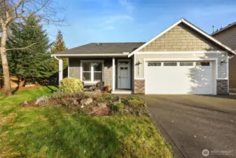 Welcome to this customized, quality built Deering & Nelson home! Situated on a very private lot bordering green space, this beautifully built rambler boasts custom upgrades such as hardwood oak flooring, vaulted ceilings, customized cabinet drawers, granite countertops, extra wide hallways, 9ft tall trayed ceilings, high-efficiency heat pump, high quality underground sprinkler system and a covered back patio for outdoor enjoyment. With several windows throughout, each space is light and bright. Shopping and amenities are nearby as well as easy access to I5. This home is very well maintained and in move in ready condition. Come take a look!