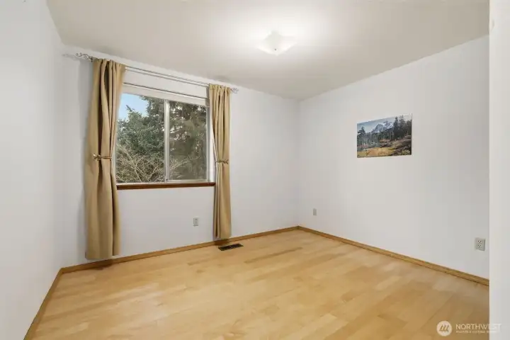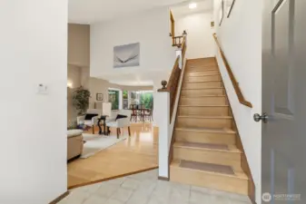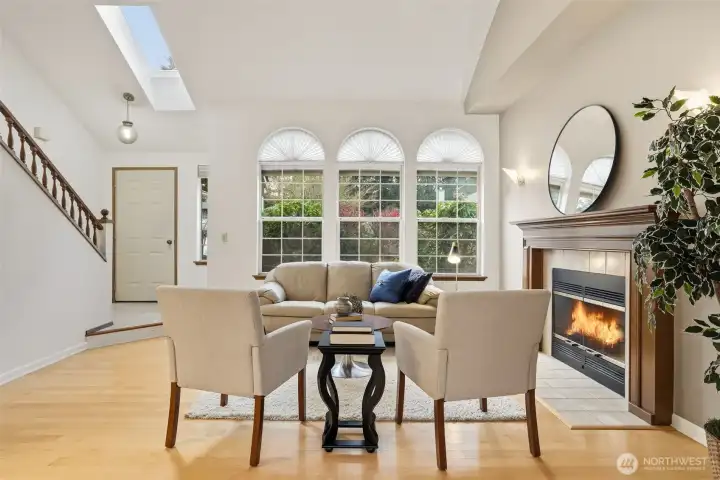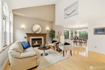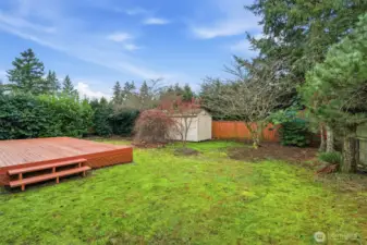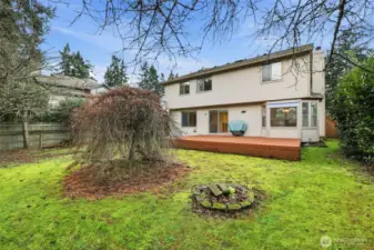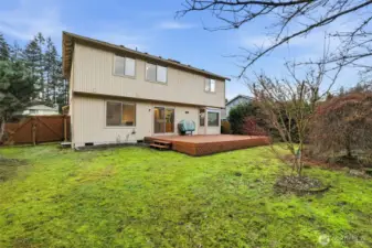 This wonderful one-owner two-story home is perfectly situated on a quiet cul-de-sac, offering a peaceful retreat. As you enter, soaring ceilings and a wall of windows fill the space with abundant natural light, complemented by a beautiful fireplace in the living room. The home features gleaming hardwood floors throughout, with the exception of the bathrooms. The updated kitchen, completed in 2010, showcases handsome mid-tone maple cabinetry, solid countertops, and stainless-steel appliances. The adjacent family room provides access to an entertainment-sized deck, ideal for hosting gatherings or enjoying intimate summer meals al fresco. This deck overlooks a sprawling, fully fenced yard, complete with an outbuilding for additional storage. An open staircase leads to the upper level, where you'll find a fabulous primary suite featuring a vaulted ceiling, plant shelf, walk-in closet, and a full bath with both a soaking tub and shower. Two additional generously sized bedrooms complete this level. Additional highlights include economical gas heating, a roof that is just 4 years old, and a newer hot water tank. All conveniently located just minutes from local amenities and freeway access.