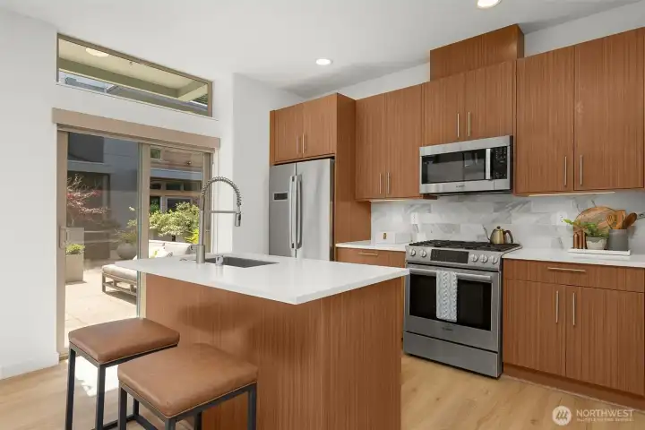 Experience the best of Alki living in this beautifully cared-for townhome, offering over 1,000 square feet of thoughtfully designed modern space just moments from the beach, local dining, and a quick commute to downtown Seattle. The bright, open-concept main level features a sunlit great room, a well-appointed chef’s kitchen, and a tranquil patio ideal for both relaxing and entertaining. Upstairs, the elegant primary suite showcases views of Puget Sound, a spacious walk-in closet, and a spa-inspired bath. An expansive rooftop deck provides the perfect setting to soak in breathtaking sunsets and mountain vistas. Built in 2018, this home blends contemporary style with quality craftsmanship, complete with a private one-car garage, and a 4-Star Built Green certification.