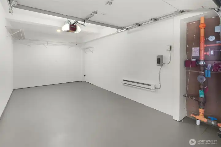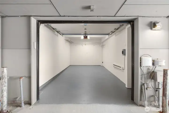This has been virtually staged to represent an option for a home office in the private garage space.