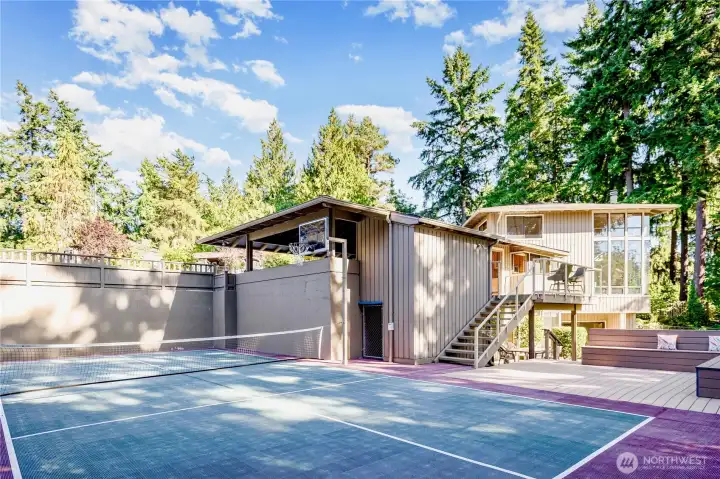 Kirkland's coveted Sandhurst neighborhood! Stunning Fred Repass custom build, glowing w/ mid-century modern charm. Enjoy the Houghton community w/proximity to Bellevue, Redmond, DT Kirkland & Seattle. Top-rated Lake Washington schools. On a cul-de-sac, this property backs to a serene greenbelt & the Cross Kirkland Corridor. Private, full-size pickleball sport court w/ basketball hoop. Large, flat backyard fully fenced. Kitchen boasts all NEW SS appliances, granite counters and backsplash. Original hardwood floors & NEW carpet throughout. New interior paint. Heated tile floor in primary bath. A/C. Vaulted ceilings. Two spacious living rooms. Workshop & greenhouse. Pride of ownership since 1988. Inspection report available. Welcome Home!