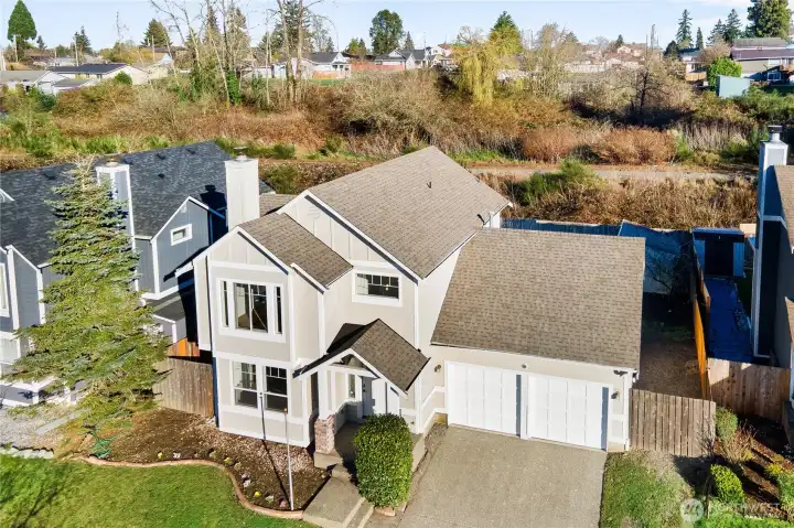 Welcome to this beautifully updated 3-bed, 2.5-bath Tacoma home offering 1,560 sq ft of bright, move-in-ready living. Vaulted ceilings and an open floor plan frame a warm main level anchored by a cozy gas fireplace, ideal for gatherings. Natural light fills the space, highlighting fresh flooring and clean, modern finishes throughout. The large chef’s kitchen shines with a generous island, white shaker cabinets, and a stainless steel appliance package. Major improvements bring peace of mind, including a newer roof, siding, HVAC system with A/C, plus refreshed kitchen and baths. A one-year home warranty is included. Set close to dining, parks, freeway access, and JBLM. Mortgage savings may be available for buyers of this listing.