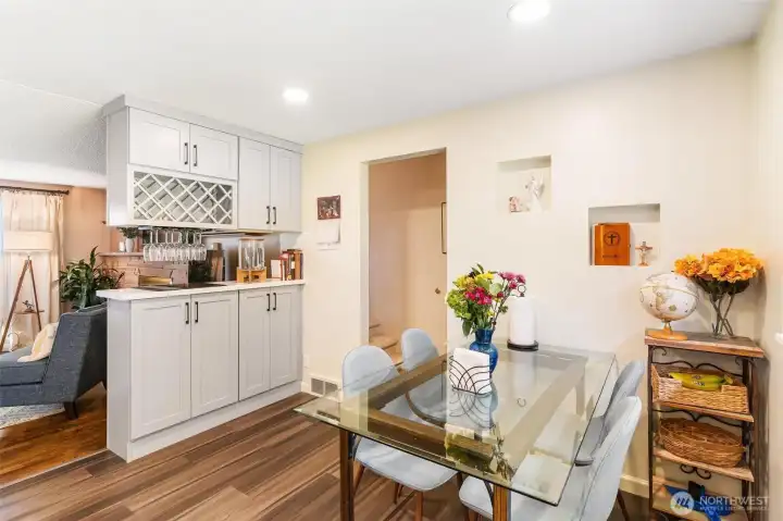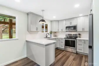 Nestled in an incredible Lynnwood location ideal for commuters, this serene property sits on an unbeatable lot and offers a perfect blend of comfort and convenience. Enjoy open-concept living with a charming living room featuring a cozy fireplace, while the modernized kitchen impresses with updated cabinetry, stainless steel appliances, quartz countertops, and a breakfast bar with adjoining eating space. Recent updates include fresh interior paint and new carpet upstairs. The one-car garage provides additional storage, and the patio offers a wonderful space for outdoor entertaining. Ideally located just minutes from Lynnwood High School, Alderwood Mall, Costco, Target, and easy access to I-5 and I-405, plus steps to Alderwood Middle, Martha Lake Elementary, shopping, dining, parks, and more—this home is a must-see!
