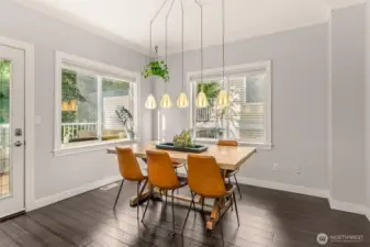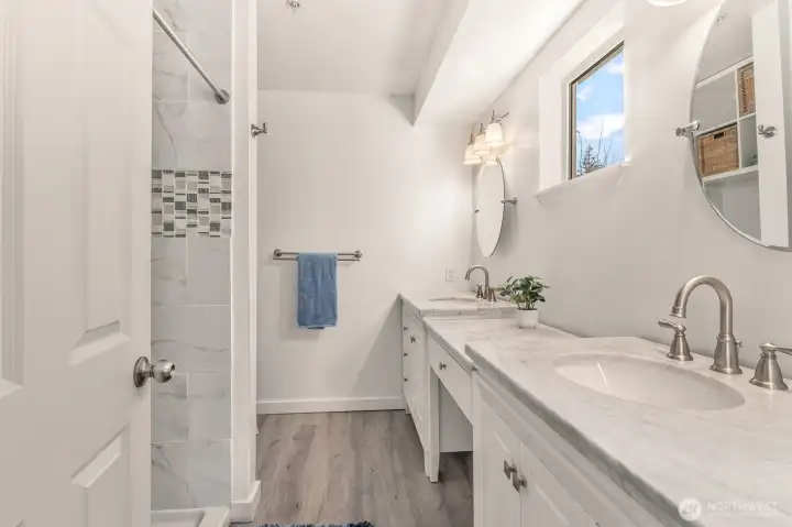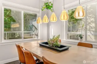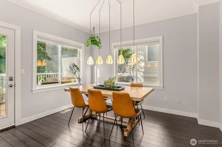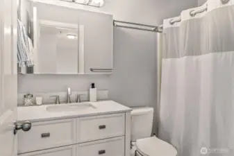 Bright, updated corner-unit townhouse in Mill Creek! The main level features a beautifully remodeled kitchen with quartz countertops, stainless-steel appliances, and impressive custom storage. Generous living, family, and dining spaces flow easily for everyday living or entertaining, plus a convenient half bath. Step out to your private balcony—perfect for BBQs or relaxing with a drink while overlooking peaceful green space. Upstairs, the spacious primary suite offers a walk-in closet and updated ensuite bath. Two additional bedrooms share a full guest bath and laundry. Enjoy year-round comfort with newly added A/C and a high-efficiency heat pump. Downstairs, the two-car garage includes an attached bonus room with a built-in Murphy bed—ideal for guests, a home office, media room, playroom, or hobby space. Prime location near Mill Creek Town Center, parks, trails, and easy access to I-5.
