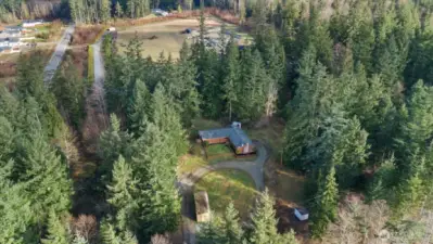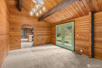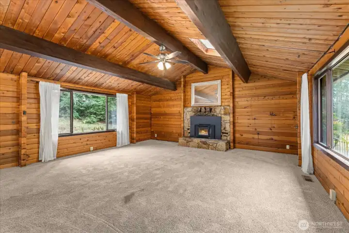 Tucked into nearly five acres of forest-wrapped privacy, this original one-level log cabin offers the rare kind of quiet that’s hard to find. Built in 1976 and rich with authentic character, the home sits adjacent to hundreds of acres of protected state land—ensuring lasting privacy, preserved trails, and a natural backdrop that won’t be developed. Inside, vaulted ceilings with exposed beams and a dramatic stone fireplace anchor the main living space. An efficient wood-burning insert adds both warmth and character, while the open living and dining area feels expansive yet grounded—designed for everyday living as well as gathering. This home offers four bedrooms and two full bathrooms, including a primary suite with an ensuite bath, all thoughtfully arranged on a single level. Outside, the acreage provides room for horses, chickens, gardens, or simply space to breathe. Located on an easy-access island with no ferry required, the property is conveniently close to everyday amenities while remaining deeply connected to nature. Two nearby state parks—including one with a boat ramp—are just minutes away, offering beaches, trails, and endless opportunities to explore the outdoors. Whether envisioned as a peaceful full-time residence tucked into nature or an unplugged retreat with room to reimagine, this is a rare opportunity to own a true log cabin sanctuary—private, authentic, and quietly special.