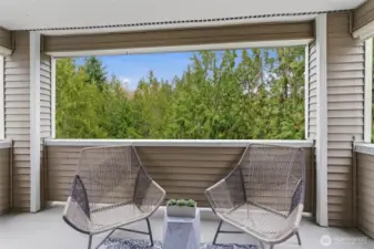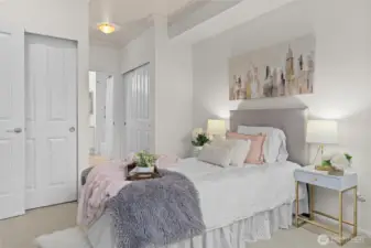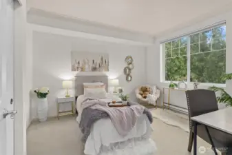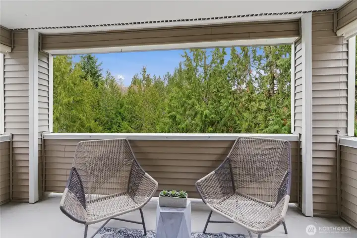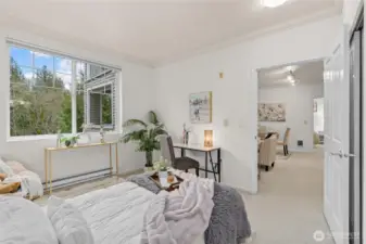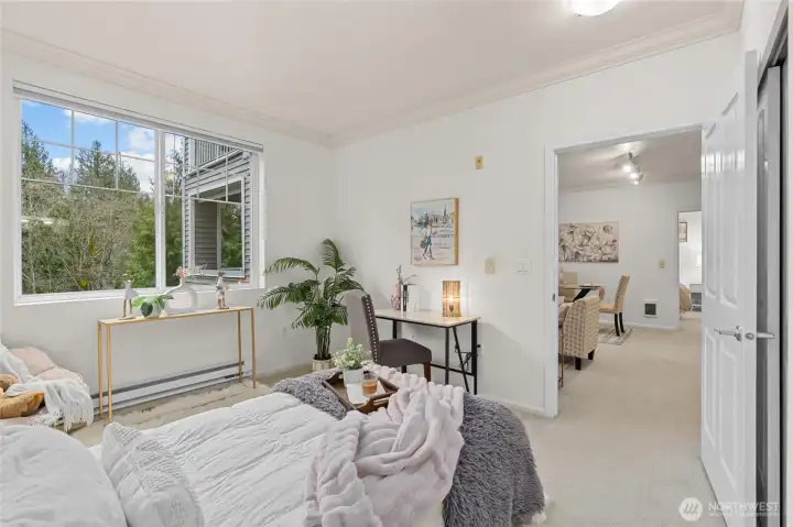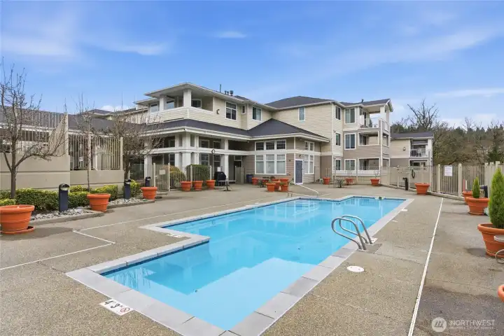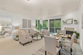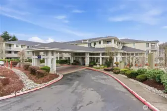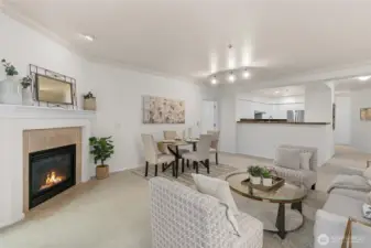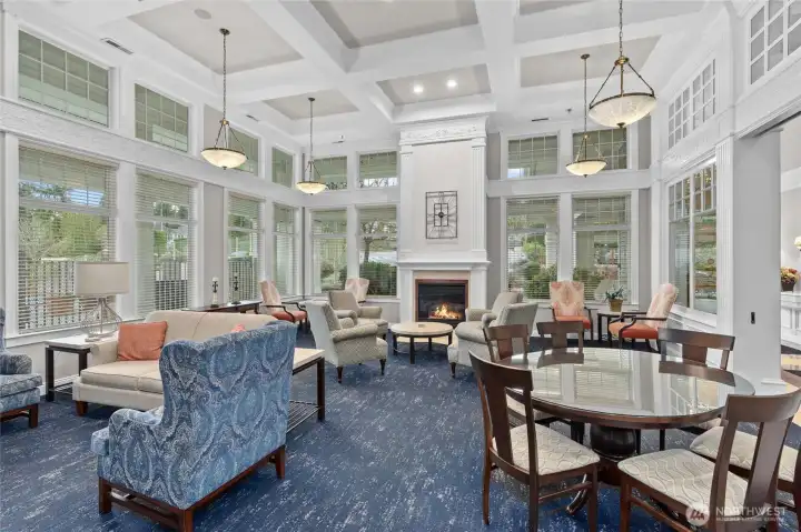 Experience refined living in an upscale, secure condo community designed for comfort and convenience. This move-in ready residence offers 1,476 square feet of thoughtfully designed space. The layout features two spacious bedroom suites plus a large den/flex room—ideal for a home office or potential third bedroom. Soaring 9-foot ceilings, quality mill work, and plush carpet with thick padding create a warm, elevated feel throughout. The kitchen is equipped with stainless steel appliances and flows seamlessly into the inviting living area, complete with a gas fireplace and blower—perfect for cozy Northwest evenings. Step outside to your private covered deck, facing east toward peaceful green space and enhanced with custom UV-blocking blinds. It’s a serene setting to enjoy morning light and quiet relaxation.Practicality meets luxury with two parking spaces in a covered, gated garage, a private storage closet, and elevator access to all floors.Community amenities support an active lifestyle, including an outdoor pool, fully equipped gym, and the elegant Grande Salon featuring a kitchen and sitting area—ideal for gatherings and special events. An indoor mailbox area adds everyday convenience. Located near I-405 and I-90, with easy access to shopping, dining, and services, this home offers both connectivity and comfort in one of the area’s most desirable settings.