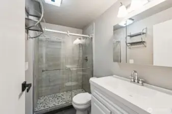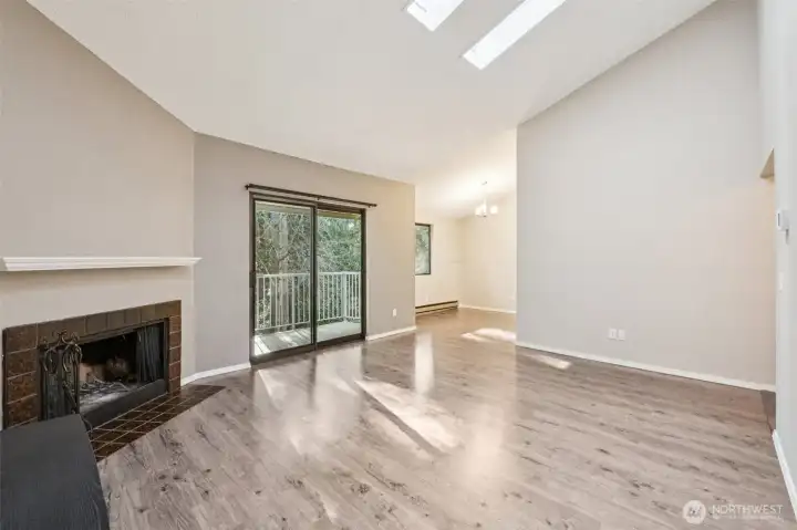Turnkey and beautifully updated, this spacious top-floor, 2 bed, 2 bath, end-unit condo offers comfort, privacy, and an airy feel in a well-managed Mountlake Terrace community close to amenities and transit. Vaulted ceilings and skylights fill the living room with natural light, enhanced by updated flooring and modern lighting. A cozy wood-burning fireplace anchors the space, while the large private balcony overlooks a serene greenbelt—perfect for relaxing or unwinding outdoors. The generous primary suite provides a peaceful retreat with an updated 3/4 bath en suite. Enjoy scenic wooded walking trails, a private outdoor pool with cabana, and a tranquil setting that makes this community especially desirable.