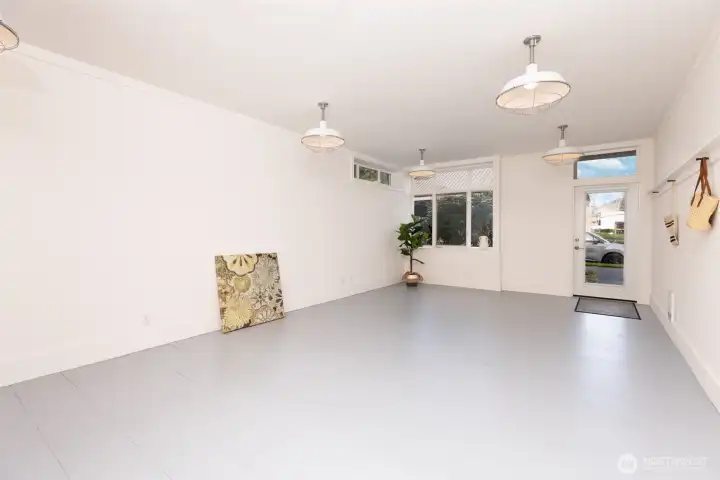 Bright, welcoming commercial space with exceptional flexibility for office, studio, gallery, or retail use. The light-filled main area showcases painted pine wood floors, classic white wainscoting, barn light fixtures, and thoughtful design details including a cast-iron enameled drainboard sink, subway tile accents, and custom ironwork elements. Custom new blinds. An updated half bath features an oversized sink and concrete tile flooring. Adjacent to the 1/2 bath is a small room that could be storage or changing room offering great versatility. Ideally located near the heart of Winslow, this space offers an authentic Island vibe, perfect for a creative studio, teaching space, collaborative hub, salon suite, beauty services or professional workspace. Smeg refrigerator included.