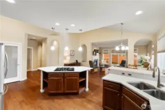 Welcome home! This one level rambler is the one you have been looking for. Walk in to beautiful hardwood floors through the entry and great room. Wonderful kitchen with quartz countertops, island with room for sitting at, stainless steel appliances, beautiful cabinetry. Great room has room for dining table and space to relax and watch TV or enjoy the cozy gas fireplace. Great interior paint color that gives you a comfortable feeling that your at home. Large primary bedroom with private bathroom with soaking tub, shower and tile floors with quartz countertops, and walk in closet. Second bedroom has plenty of space and convenient to guest bathroom with quartz countertops and tile floors as well. Separate laundry room and all appliances stay. Office/den is large, and a closet was originally in the plans but owners chose to not have one installed, tax records show 3 bedroom, install a closet to make it a bedroom. Step outside to a large semi covered patio with your view of Mount Rainier. Entire yard has sprinkler system. This home comes with A/C and a Generac Generator, so you never have to worry about losing power! Great location close to mall, shopping, and quick access to freeways.