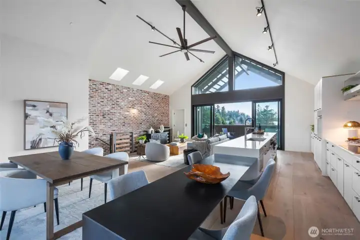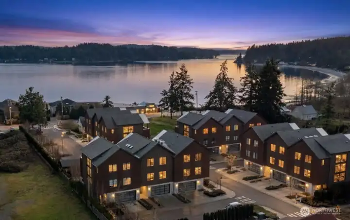 Discover the pinnacle of island sophistication in this sun-drenched, loft-inspired townhome within the acclaimed Roost community. Serviced by a private elevator the residence flows seamlessly across three levels of architectural excellence. The interior radiates a Scandinavian aesthetic, featuring soaring vaulted ceilings, reclaimed brick accents, and expansive Pella sliders that frame views of Rich Passage. The heart of the home is an entertainer’s dream, anchored by a chef’s kitchen with a massive quartz waterfall island and premium Bosch appliances. Step out onto the covered deck to enjoy year-round alfresco living by the fire pit while watching ferries glide past. The primary suite offers a spa-like escape with heated floors and a deep soaking tub, while "Level 5" finishes throughout provide a gallery-quality backdrop for your art collection. Located just steps from the vibrant Lynwood Center, Pleasant Beach Village, and a nearby playground, you are perfectly positioned to enjoy historic cinema, coffee, wine tasting, and live music, along with the scenic trails of both Fort Ward and Gazzam Lake—all while dipping your toes in the Sound each evening at sunset. This is more than a home; it is an effortless, luxurious retreat in the heart of Bainbridge Island’s most walkable enclave.