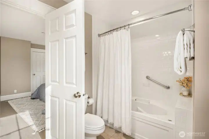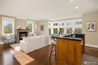 This impeccably maintained residence offers 1,952 sq ft of comfortable living combining thoughtful details with an unbeatable Winslow location. High ceilings throughout create an airy, elegant feel, beginning with a stone-tile entry that sets a polished tone. The main level features a nicely appointed office, den and an open-concept kitchen with dining/living great room, ideal for both everyday living and entertaining. The kitchen is finished with stone tile countertops, stainless steel appliances, and beautiful cabinetry, while engineered wood floors and a cozy propane fireplace add warmth and sophistication. Large windows fill the space with natural light, and double doors from the den open to a private Juliet balcony. The upper level hosts two generous bedrooms, each with ensuite bathrooms and deep closets, along with a laundry room offering ample storage. Outside, tandem parking includes one covered space, and the intimate six-unit complex provides a quiet, private atmosphere. Just steps from the ferry and downtown Winslow’s shops, dining, theater, and arts scene, this home delivers comfort, quality, and an exceptional location.
