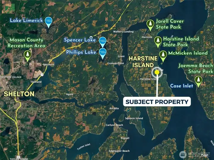 4.91 acres with waterfront access overlooking Case Inlet, McMicken Island, & Mount Rainier. Strong development potential with power available at the road, and soils that are generally suitable for supporting a septic system. This lot is mostly wooded with a mix of mature conifers and hardwoods, plus a small clearing near the gated entry. McMicken Island Marine State Park is less than 200 feet away, offering more than 100 acres to explore, including a walkable sandbar that connects to McMicken Island at low tide. Peaceful and private setting with no HOA or CC&Rs. Under 30 minutes to Shelton and just over an hour from Tacoma. This is a rare opportunity to bring your vision to life in a truly special setting.