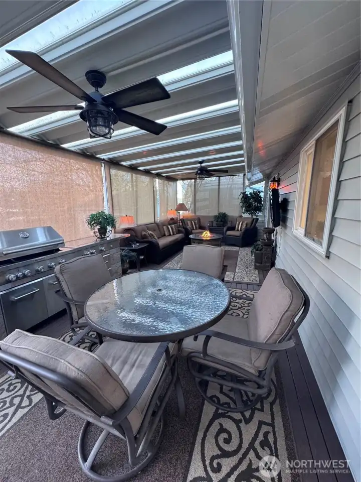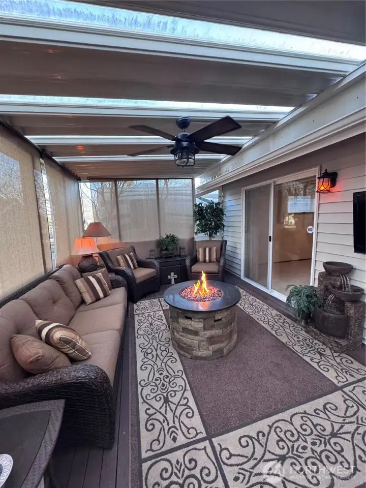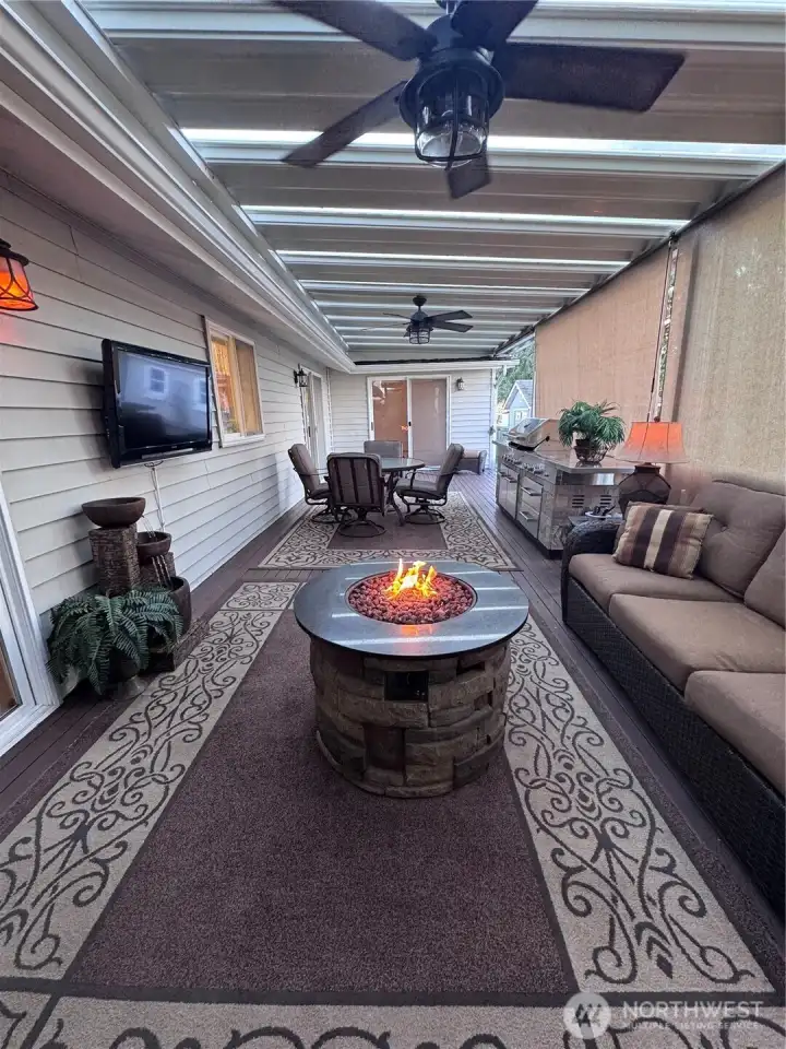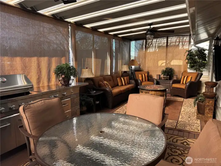 Welcome to this single story home located in of Camano's most sought-after gated communities where you can enjoy year round golf, 2 seasonal swimming pools, clubhouse and community lake. This bright, spacious home features a large primary bedroom with 2 closets and 3/4 bathroom with sliding door to deck on 1 side of home and a second bedroom, full bathroom and a office/den with sliding door to deck on the other side. The updated kitchen offers newer stainless steel appliances and quartz countertops. The dining room, off of kitchen, was designed to accommodate a large china hutch and table for seating 8-10 people. Living room features a natural gas stove that heats the home. Additional features include a 400 sq ft covered and partially glassed deck with TV for "all seasons" entertaining. Fully fenced sunny backyard with 2 Yardline 10 x 12 storage sheds. Beautifully landscaped with privacy ~ raised garden beds ~ Jacuzzi Hot Tub off deck and an Almost Heaven 4 person barrel sauna in yard. Large RV parking with electric hookup along 1 side of home and other side of home has gated driveway to golf cart shed. Home has an automatic battery backup system for power outages and is also wired for a generator with natural gas hookup.