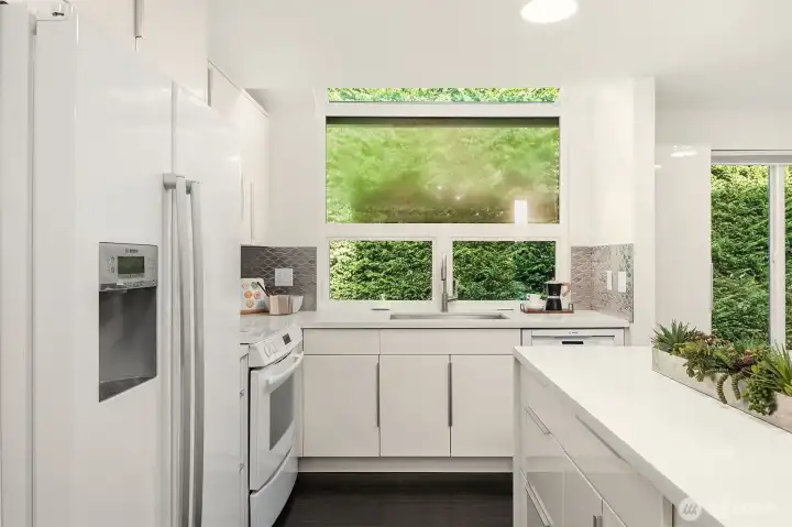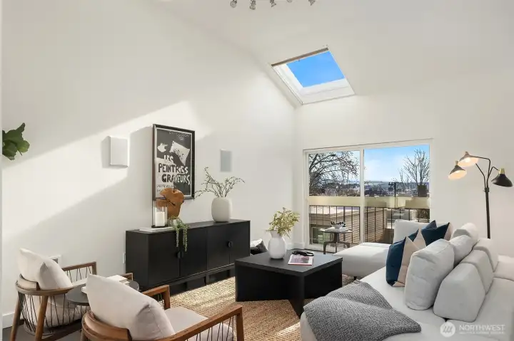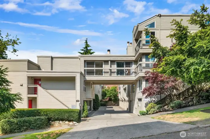 Enjoy stunning views of the Space Needle and Puget Sound from the living room of this end-unit condo in Queen Anne. Positioned away from street traffic and just blocks from Climate Pledge Arena, Seattle Center, dining, and shops, this location offers convenient access to some of Seattleās best amenities. Quick access to Hwy 99 and I-5 makes commuting easy. Features include quartz counters, high-gloss cabinetry, Bosch appliances, wood floors, vaulted ceilings, recessed dimmable lighting, and multiple skylights, including one in the bathroom. Includes a dedicated garage space, carport, and plenty of storage.