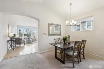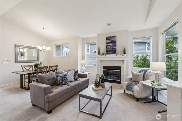 This inviting townhome feels like a place to unwind, settle in, and enjoy the simple moments of everyday living. Presented in truly move-in ready condition, it offers a welcoming blend of comfort, style, and thoughtful design. High ceilings on both levels add volume and light, while the vaulted ceiling in the formal living and dining rooms brings an elegant sense of openness. The gas fireplace, framed by a marble surround and classic mantle, provides a warm focal point for relaxing evenings or gatherings. Maplewood flooring flows through the kitchen, nook, and family room, offering both beauty and durability in everyday living spaces. The primary suite is conveniently located on the main level and features a generous walk-in closet and a five-piece bath designed for comfort and ease. The lower level offers a spacious recreation room with direct patio access, ideal for entertaining, hobbies, or quiet downtime. Two additional bedrooms, two full baths, and a large storage room provide flexibility and functionality to suit a variety of needs.