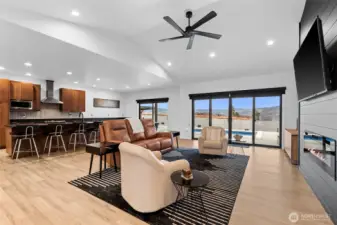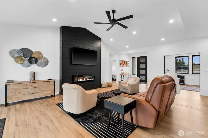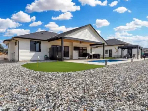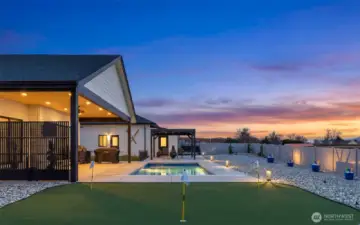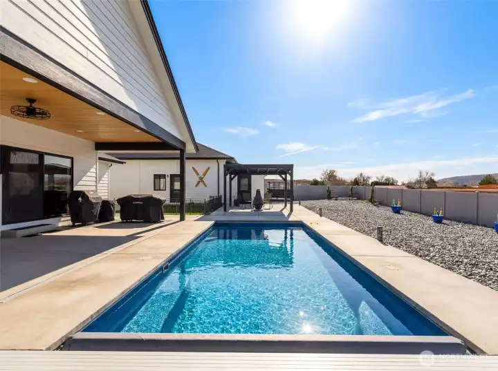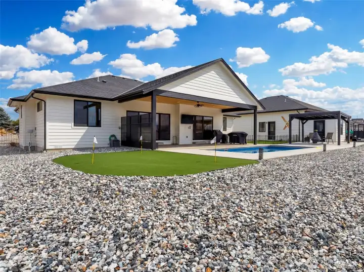 Welcome to your own private staycation retreat, a meticulously maintained single-level home where every detail has been thoughtfully designed for comfort, style, and effortless living. Set on a pristine, no-maintenance .55-acre lot, this property checks every box with a 3-car garage, plus a detached extra-deep shop complete with a ¾ bathroom, ideal for projects or storing all your toys. Step outside and feel like you’re on vacation every day in the fully fenced backyard featuring an in-ground heated and cooled pool, a putting green, room for RV parking, and no covenants to limit your lifestyle. Inside, the home showcases a stunning modern design with hard-surface LVP flooring throughout, a sleek chef’s kitchen with an abundance of counter space, and beautiful custom cabinetry by Bagdons Cabinets along with stainless appliances, granite countertops and a perfectly designed walk-in pantry. Enjoy high ceilings in the living space with a modern fireplace. The well-planned split bedroom layout offers two bedrooms and a full bath on one side, a centrally located office with a utility closet, and a private primary suite tucked away on the opposite side. The primary suite is a true retreat with direct patio access, a dedicated dog run, and a gorgeous ensuite featuring double sinks, a tiled walk-in shower, and a show-stopping custom walk-in closet. This home truly delivers resort-style living with the freedom to enjoy it your way.