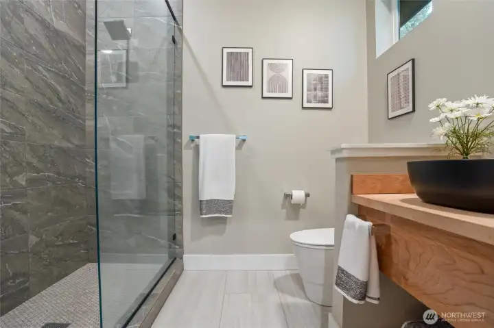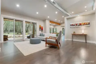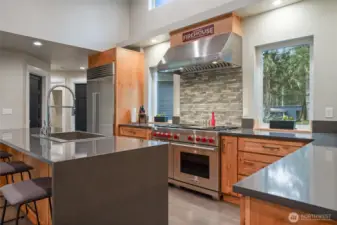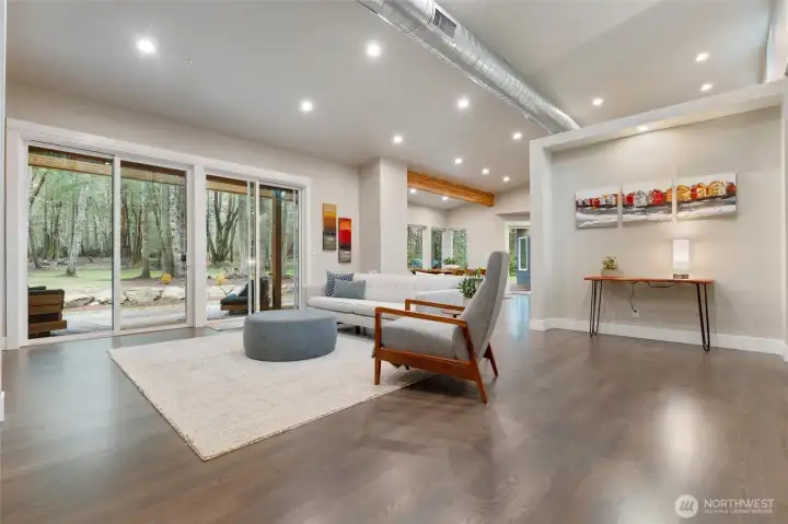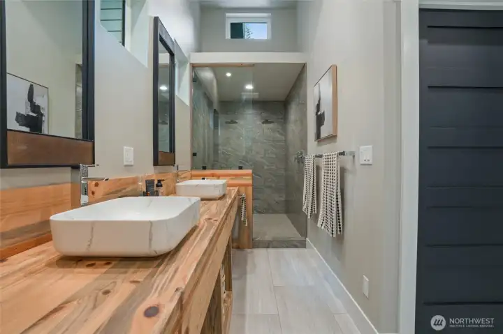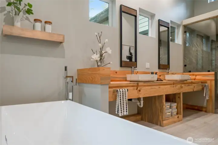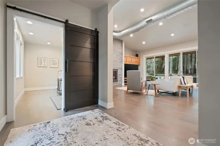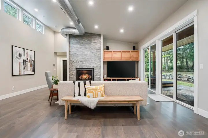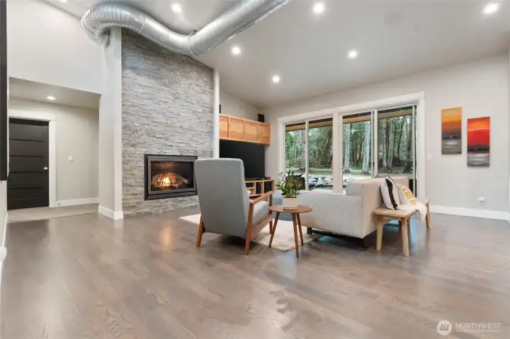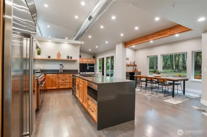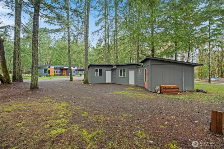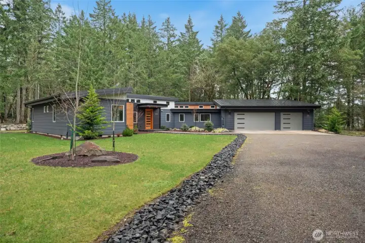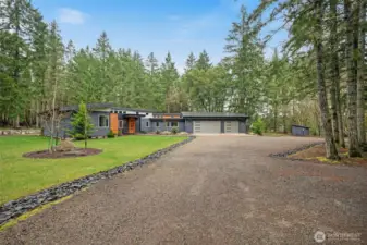Custom architect-designed modern retreat on gated acreage in Longbranch. Designed by Mascord Design of Portland , this home blends modern, industrial, and rustic elements with exceptional privacy and livability—ideal for anyone seeking refined space in a peaceful Pacific Northwest setting. Features 3 private ensuites, with the primary suite thoughtfully separated to create a true owner’s retreat. Interior highlights include exposed spiral HVAC ducting, true white oak floors, solid hickory cabinetry, Wolf & Sub-Zero appliances, quartz countertops, and a striking stone fireplace. The open, flowing layout delivers elevated living designed for comfort, entertaining, and working from home. Exterior architecture showcases multi-textured cement siding with cedar accents, cedar tongue-and-groove soffits, and a standing seam metal roof. An oversized 1,100 sq ft three-car garage provides exceptional flexibility for storage, workshop space, or recreation. Gated entry, circular gravel driveway, stamped concrete apron, and a serene wooded setting complete the arrival experience. The acreage includes multiple architecturally cohesive outbuildings, including a large covered storage/shop for RVs, vans, equipment, or recreational toys, plus a separate well/pump structure with its own 200-AMP electrical service. Located approximately 25 minutes from town, this property offers a rare balance of seclusion, modern luxury, and accessibility. A unique opportunity to own a luxury home on acreage.