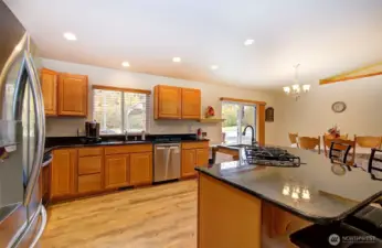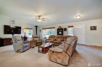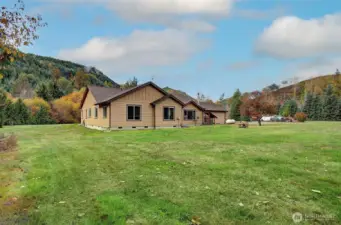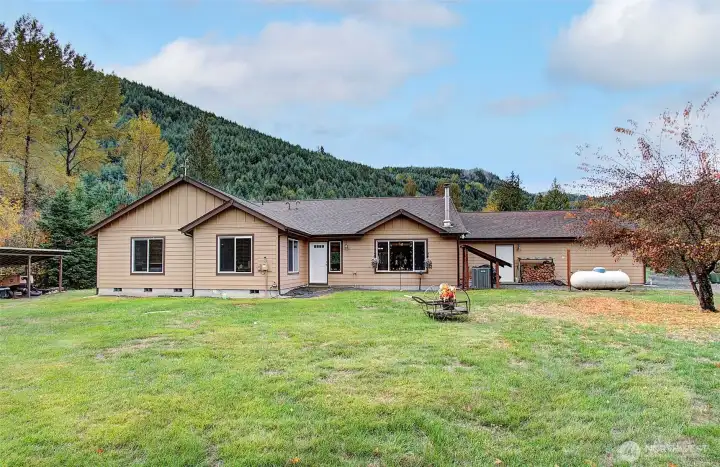 Hard-to-find single-level, no-step home on 5 private acres with room to grow and a creek—perfect for outdoor enthusiasts. This 2,208 sq ft home (built 2012) offers 3 beds, 2.5 baths, and a bright open-concept layout with vaulted great room and abundant natural light. Spacious kitchen features granite counters, large island w/bar sink, propane cooktop, convection oven, built-in microwave, birch cabinets, and walk-in pantry. Living area with cozy wood stove. Primary suite includes walk-in closet, patio access to hot tub, and accessible shower w/dual heads. Flexible space for guests or office. Guest bath with split layout and dual sinks. Features: 400 AMP service, Lennox heat pump, tankless hot water, 24x33 heated garage w/workshop space, no-step entry, wide doorways, mudroom/laundry. Private well (1,700-gal reservoir), septic, 16KW generator, RV hookup, pumphouse w/loft. Circle driveway, private walking path through wooded acreage to your own creek, fenced orchard, abundant wildlife. Plenty of room to build a shop. Peaceful Glenoma setting just ¼ mile to Hwy 12. White Pass Ski Area ~30 min, Riffe Lake ~10 min. Views of Kiona Peak.