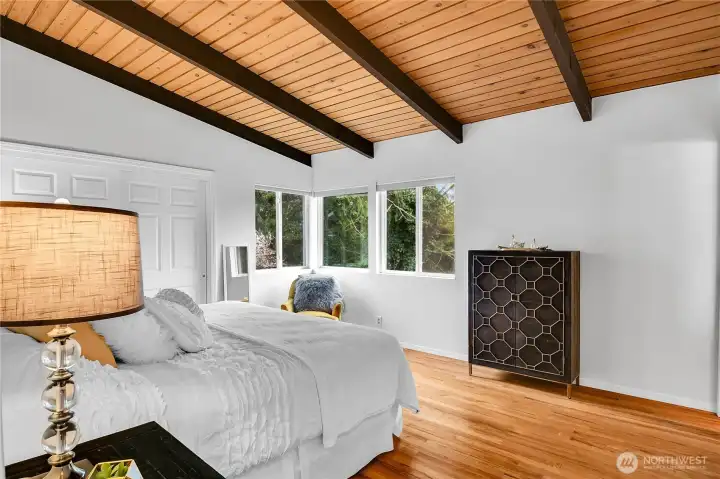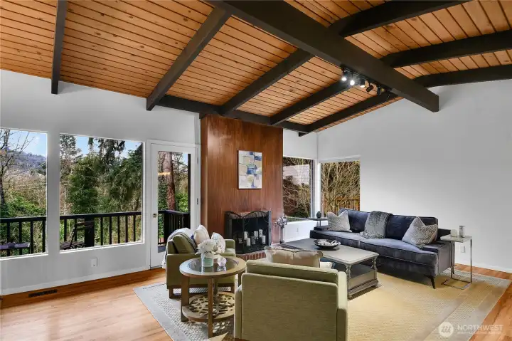 Spacious and light-filled home in the desirable Newport Hills neighborhood offering 2,940 SF, 4 bedrooms, and multiple gathering spaces designed for comfortable living and entertaining. The main level features a wood burning fireplace, soaring alpine wood-beamed ceilings and expansive windows that open to serene greenbelt views, creating a warm and inviting atmosphere throughout the living spaces. The kitchen includes an eat-in breakfast nook and connects easily to the formal dining area, making it ideal for both everyday living and hosting. The main level also offers a private primary suite with ensuite bath, along with two additional bedrooms. Downstairs, the expansive lower level provides exceptional flexibility with a large rec room featuring a wood-burning fireplace, wet bar, and refrigerator, perfect for movie nights, game days, or entertaining guests. A fourth bedroom with a full bath on this level creates an ideal space for guests. Enjoy the outdoors from two separate outdoor living areas, including an upper-level deck overlooking the greenbelt and a lower patio with access to a private yard. Additional highlights include abundant storage and covered parking for two vehicles. Conveniently located minutes to I-405 and I-90, with easy access to the shopping, dining, and amenities of Factoria and Newcastle, this home offers space, comfort, and a fantastic Eastside location in the coveted Bellevue school district.