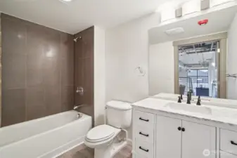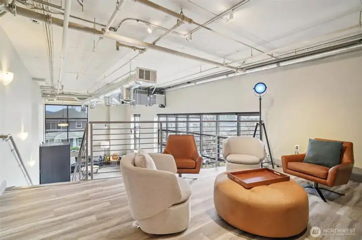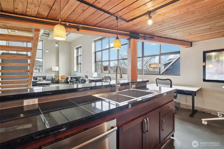 Rare opportunity to own a commercially zoned live/work condo in the highly sought-after Starpoint community in the heart of Issaquah Highlands, offering valuable high-traffic, street-front exposure. This prime ground-floor end unit features a formal storefront entry, ADA-accessible bathroom, soaring ceilings, and walls of windows with solar shades that flood the space with natural light, creating a striking modern urban aesthetic with polished concrete floors and track lighting. The flexible layout allows for a wide range of uses including office, medical/dental, daycare, salon, massage clinic, coffee shop, and more. A beautiful kitchen with granite countertops and stainless steel appliances, washer/dryer hookup, and main area stubbed for additional plumbing enhance functionality. Upstairs offers a loft/bedroom with full bath and walk-in closet for added versatility. Equipped with HVAC and includes two dedicated parking spaces (one secured underground/garage). Just minutes to parks, trails, excellent restaurants, theater, and great shopping!