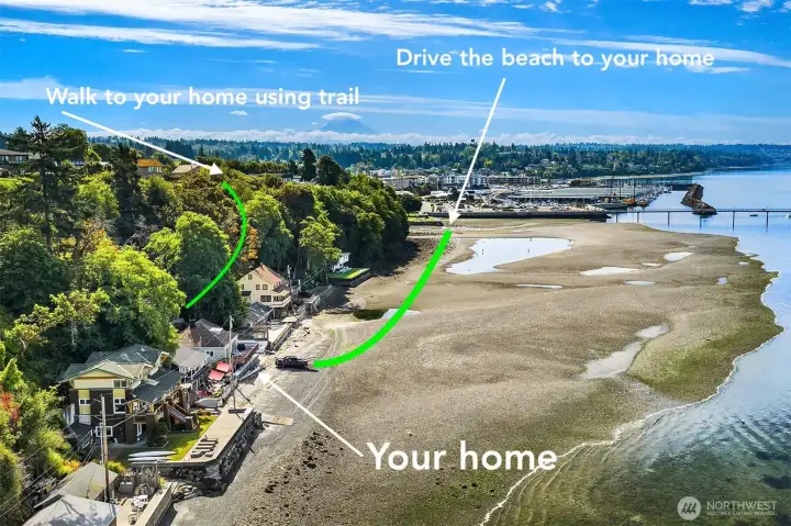 Welcome to last remaining community in King County where you can use the beach to drive to your home. 81' of waterfront in with tidelands extending approx 200' into Sound (incl private boat moorage). This is a walk-down or beach drive access waterfront retreat; park above the property and walk down, or, use private access to the beach to drive to your waterfront venue. Home has 2 levels w/potential for a third. The main floor is approx 1,400 sqft, 2 bd, 1 full bath. Lower level w/ sep entrance (ADU?), is approx. 870' & has 1 bd, 3/4 bath. Upstairs (not counted in sq. footage) is plywood & drywall away from a crow's nest, rec. room or office. From your front yard, go walking or SUPing north to Marine View Park or south to Des Moines Marina.