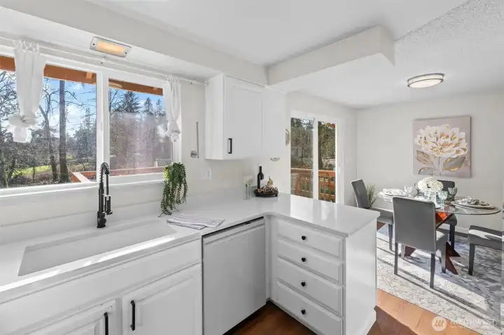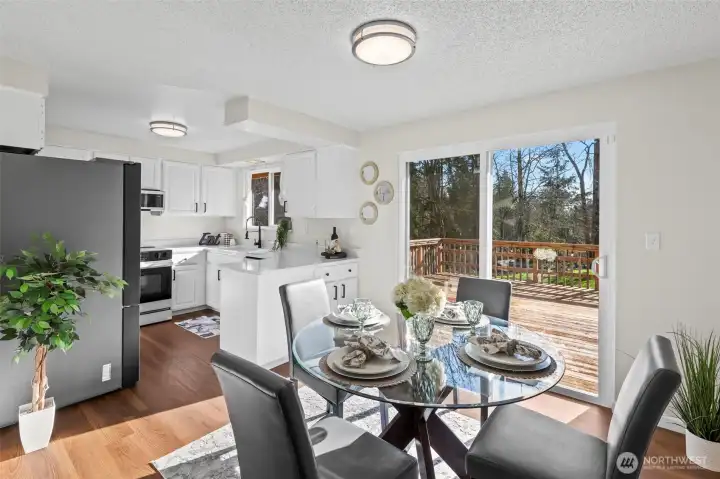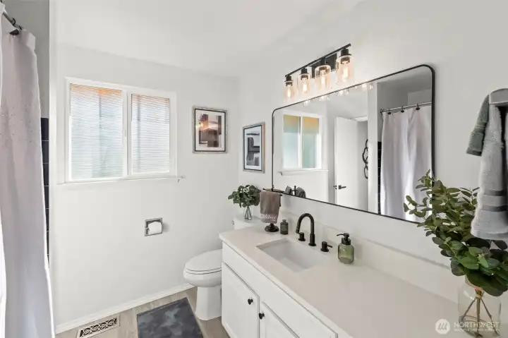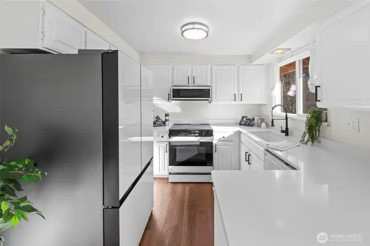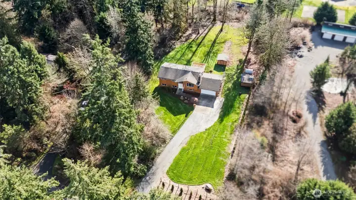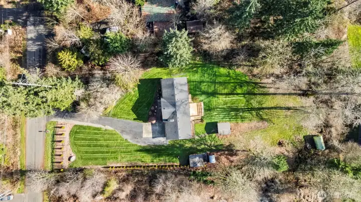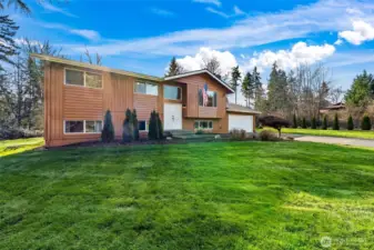 Welcome home! This split-level gem offers privacy and tranquility on nearly an acre, tucked away at the end of a quiet dead-end street. The upper level features three spacious bedrooms, a full bath, and a bright kitchen with new quartz countertops and sleek white Samsung Bespoke appliances. The living room is filled with natural daylight, perfect for relaxing, and complete with a cozy wood-burning fireplace. The lower level with an additional entrance offers outstanding versatility with separate living area, possible 4th bedroom or office, ¾ bath, and a large bonus or recreation room—ideal for entertaining or multigenerational living. Additional recent home updates include a newer furnace, windows, flooring, and wood stove. Parking is a breeze with a 2-car garage plus an extra-long driveway, perfect for an RV, boat, or additional vehicles. Outside, enjoy low-maintenance, beautifully established grounds designed to inspire gardeners, featuring two outbuildings, a greenhouse, newer fencing, and both a patio and deck for seamless outdoor entertaining. Conveniently located near I-5, Hwy 512, JBLM, shopping, dining, and freeway access, this private retreat offers space and convenience—all without an HOA. A rare opportunity you won’t want to miss!