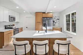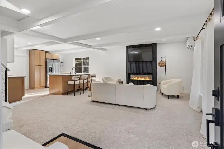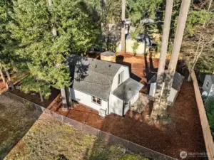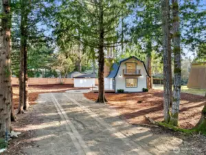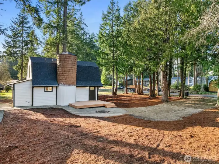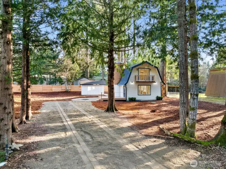 Charming, fully updated home tucked away in Lakebay, offering privacy, style, and modern comfort. A long driveway lined with mature trees leads you to this peaceful retreat. Inside, the open-concept layout features great sightlines and an easy flow for everyday living and entertaining. The living room showcases new flooring, tray ceiling details, a cozy electric fireplace, and a striking dark accent wall. The modern kitchen is beautifully designed with two-tone white and oak cabinetry, farmhouse sink, stainless steel appliances, quartz countertops, subway tile backsplash, and a large center island with eating bar. The main-level full bath features stylish black hardware, a tiled shower surround, and a modern vanity. A spiral staircase leads to the upper-level bedrooms and a ¾ bath with a walk-in shower and tile surround. One bedroom opens to a private upper-level deck through a sliding door. Recent upgrades include a new roof, new windows, new interior and exterior paint, new trim, updated interior doors and fixtures, luxury vinyl plank flooring, a new mini-split AC system in the primary bedroom and living room, and new fencing. The spacious lot offers a deck, patio with built-in fire pit, and a storage shed—perfect for enjoying the outdoors year-round.