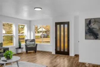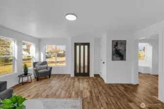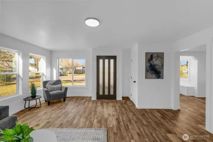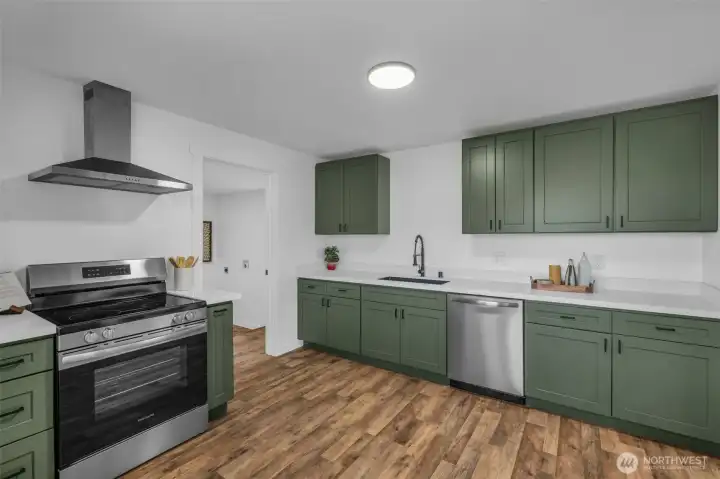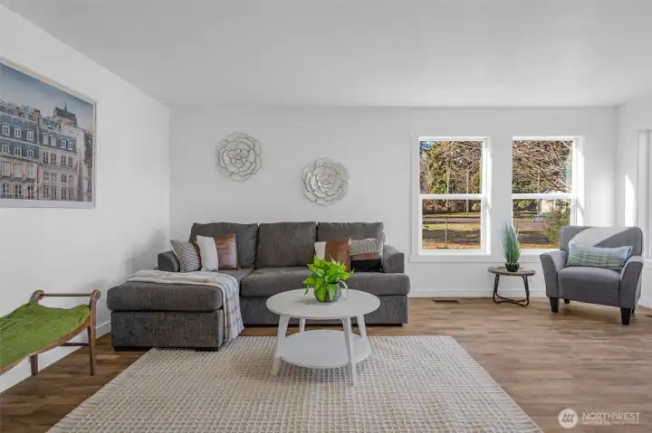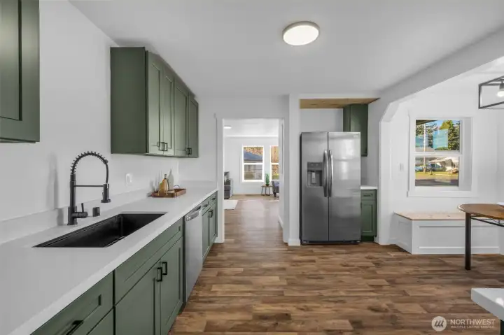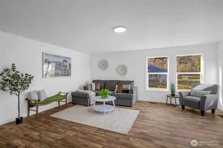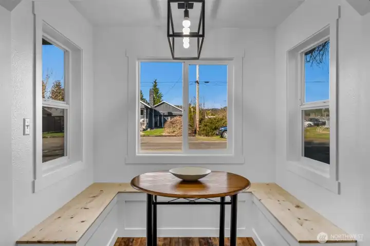 Welcome home to this nicely updated 3 bed 2 bath home! Lots of updates but it still kept some of that original charm! All new flooring, new paint inside and out, a new electrical panel, a new roof, all new kitchen cabinets and appliances that stay! Tons of natural lighting with large windows greet you as you walk in. The spacious floorplan makes it great for entertaining. To the left, enter the kitchen that has a charming nook for your kitchen table to enjoy your morning coffee surrounded by windows. Another door leads you to a utility room with access to your roomy garage with space for parking and extra room for storage. Back inside a hallway off the living room leads to three bedrooms and a hallway bathroom with updated fixtures. The first two bedrooms each have a beautiful original built-ins spanning an entire wall! But it doesn't stop there! Step into your large primary bedroom where you'll find another all wood built-in offering a plethora of storage options while maintaining a touch of the past. Including a built in bookshelf at the end! With a sliding glass door providing outdoor access with a deck and more natural light! A full bathroom off the primary offers more convenience with all updated fixtures and tile. Enjoy the yard with plenty of room for a garden or pets! Come take a look at all this home has to offer today! A quick scenic commute to the Olympia area!