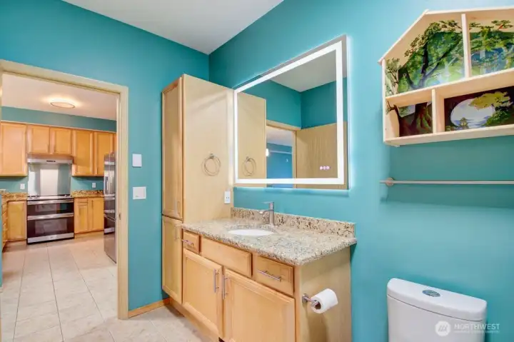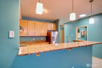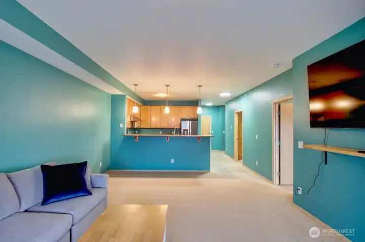 Exceptionally upgraded, move-in-ready 950 sq ft top-floor condo within walking distance to Whatcom Community College in Bellingham—ideal for campus living, long-term value, or investment potential. No rental cap at this complex. This quiet 1-bedroom, 1 full bath unit includes a versatile bonus room ideal for a home office or storage, a dedicated utility room with in-unit LG smart washer and dryer with steam, and a walk-in closet with custom built-in shelving and brushed nickel hardware. The renovated interior features granite countertops in the kitchen, bathroom, and vanity, plus a butcherblock laundry counter. The kitchen is equipped with premium stainless steel appliances including a GE 6.6 cu ft double convection range, Samsung 22 cu ft French-door smart refrigerator, and Pacific Tru-Steam hood with auto steam-clean. Smart and energy-efficient upgrades include a Mysa smart thermostat, Rheem 38-gallon water heater, LED lighting, and Levolor honeycomb cellular shades. Modern finishes include designer BEHR Dynasty paint, brushed nickel fixtures, screwless outlets and switches, quiet Panasonic Whisper ventilation fans, WaterRidge dual-flush toilet, and LED anti-fog mirrors. Enjoy a west-facing deck with access from both the living room and bedroom, offering privacy, quiet living, and sunset views. Two wall-mounted 65” 4K Google smart TVs, two deeded covered parking spaces, and excellent walkability to shopping and transit complete this rare, turnkey opportunity.