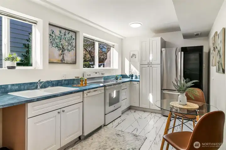 Welcome to your move-in-ready Green Lake home! This exceptional residence offers 3 spacious BRs, 2.75 BAs, and 1700 Sq Ft of living space. The living room features LVP, a cozy fireplace, and large picture windows, creating a warm, inviting ambiance. The formal dining room with LVP seamlessly connects to the updated kitchen, featuring ample cabinetry and an eating area. All BRs are conveniently located on the same floor, with the primary BR offering an ensuite 3/4 bath. For added versatility, the lower level presents a second kitchen, family room with fireplace/woodstove, W/D, and room for endless possibilities. Outside, a charming yard with mature plantings awaits, complemented by a 2-car attached garage and driveway parking. Updates include a new roof, fresh paint, and additional lighting enhancements. The prime location offers walkability to Phinney Ridge and Green Lake, as well as an effortless commute to Downtown Seattle.