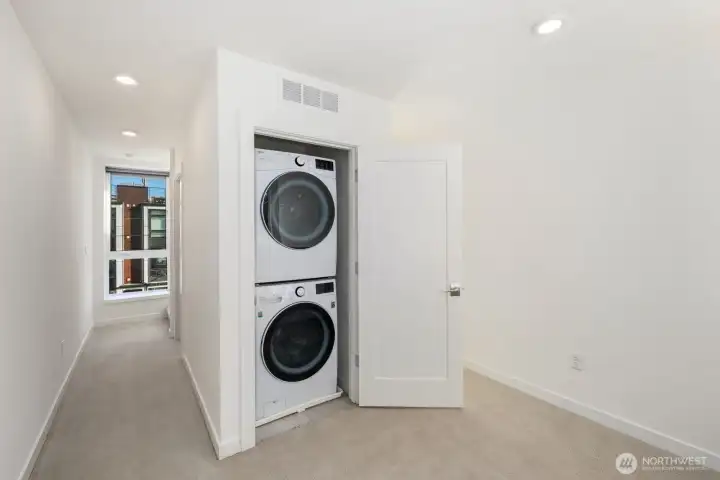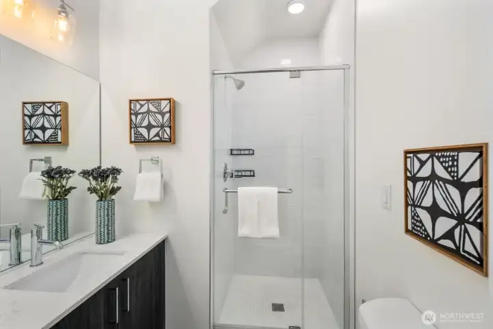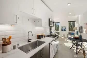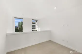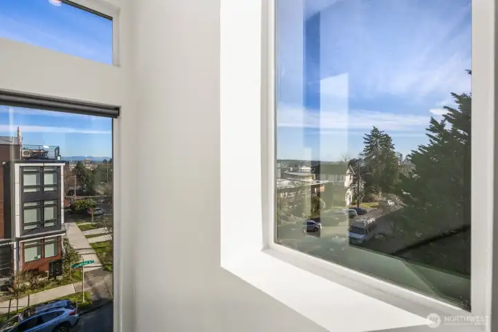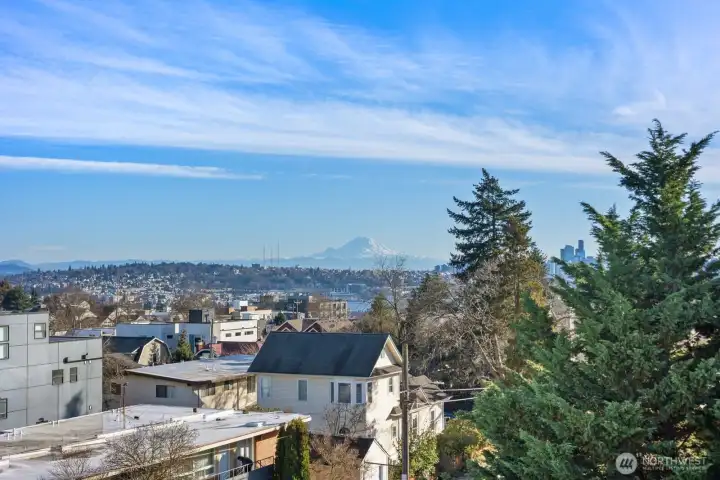 Sun-filled end unit townhome on a quiet street between Fremont and Phinney Ridge, prime location just minutes to shops, dining, and easy Seattle access. The home features vaulted ceilings, wide-plank floors, and abundant windows with views throughout. The main living space complements a sleek kitchen with quartz counters, stainless appliances, and a Bertazzoni gas range. Flexible loft with half bath, top floor private primary suite with designer bath, and lower-level bedroom with full bath tucked away from main living areas. Enjoy a sunny rooftop deck off the primary with sweeping views of Mt. Rainier, Lake Union, Lake Washington, and the skyline. 4-Star Built Green with mini-splits, A/C, fresh paint, and move-in-ready appeal.