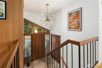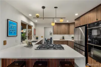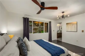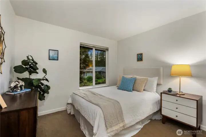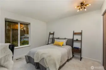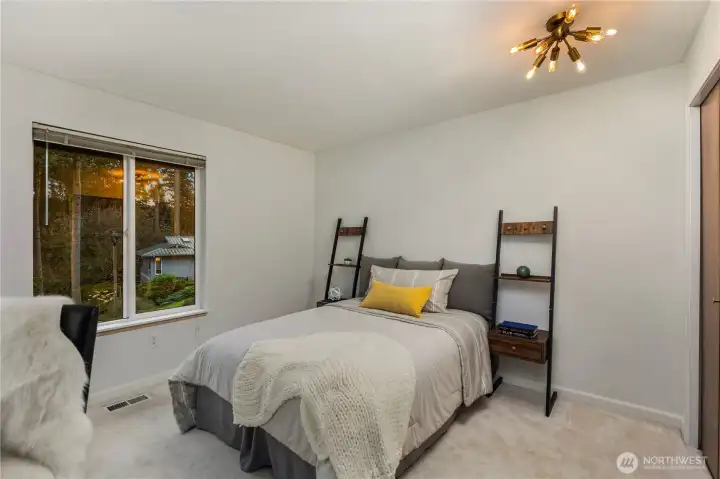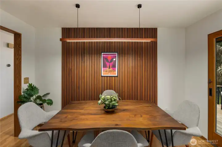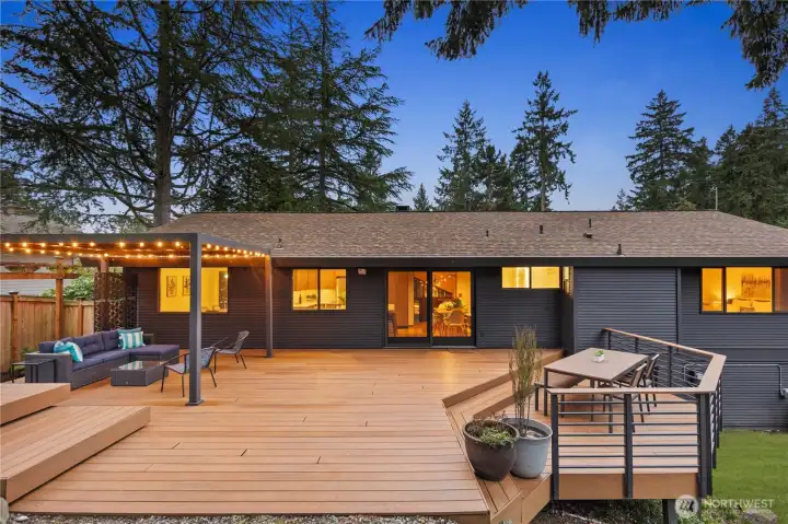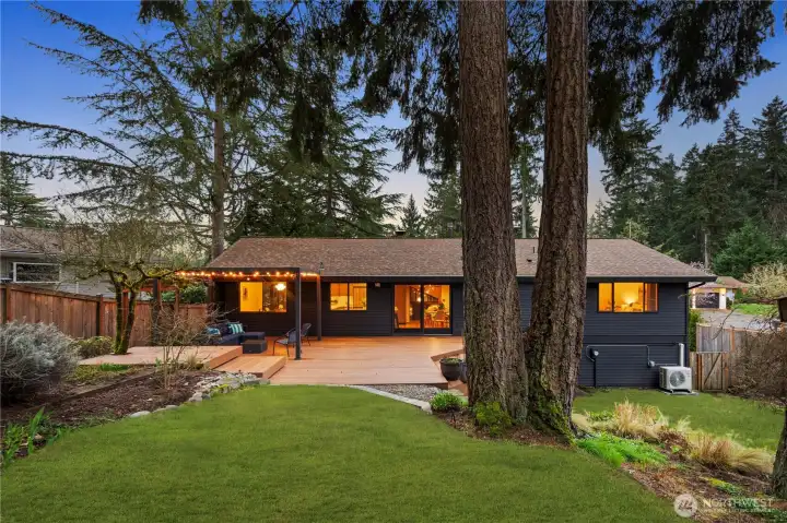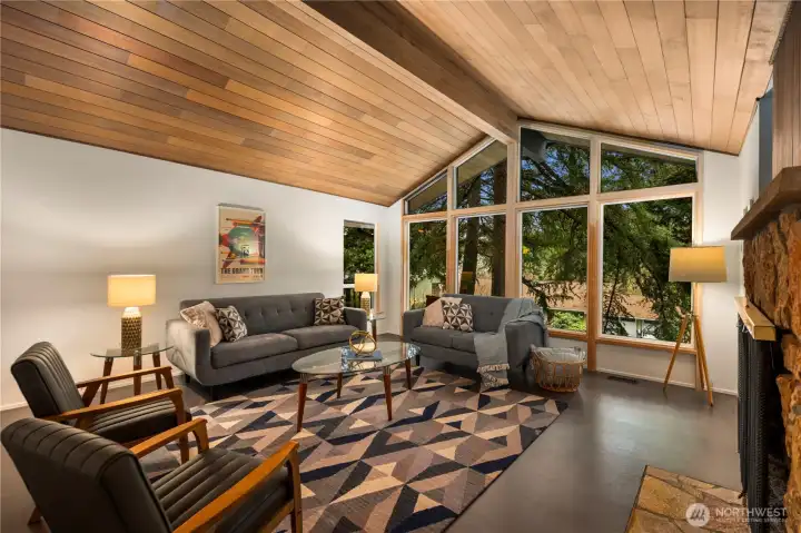 Beautifully updated NW Contemporary nestled in Crestwood Park, this thoughtfully upgraded 4 bedroom, 2.5 bath home blends warm architectural character w modern upgrades. A stunning vaulted cedar ceiling anchors the main living space while expansive windows & hardwood floors create a bright, inviting interior. The remodeled kitchen pairs style & function w quartz countertops, refined cabinetry, updated lighting, stainless steel appliances & a pull-out pantry offering ample storage. It opens to an expansive, custom rebuilt deck w pergola & lighting. Outdoor spaces have been reimagined w upgraded hardscaping & fire pit, creating a private setting for relaxing, gathering or play. Spacious primary suite offers a peaceful retreat complemented by a beautifully remodeled bath w dual vanities, contemporary brass fixtures & sleek glass shower. Two additional bedrooms upstairs & a stunning remodeled guest bath provide comfortable accommodations for residents or guests. Lower level offers flexibility w a potential 4th bedroom & office or guest room, plus an expansive entertainment space featuring polished concrete floors, custom slat-wood accents, a fireplace & fantastic home theater setup including a 125” screen, projector, surround sound wiring & blackout blinds. Dual heating & cooling systems keep you comfortable year round: a new efficient heat pump (heat & A/C) + a new backup furnace. Wonderful neighborhood w nearby walking & biking trails. Top rated Bellevue schools.