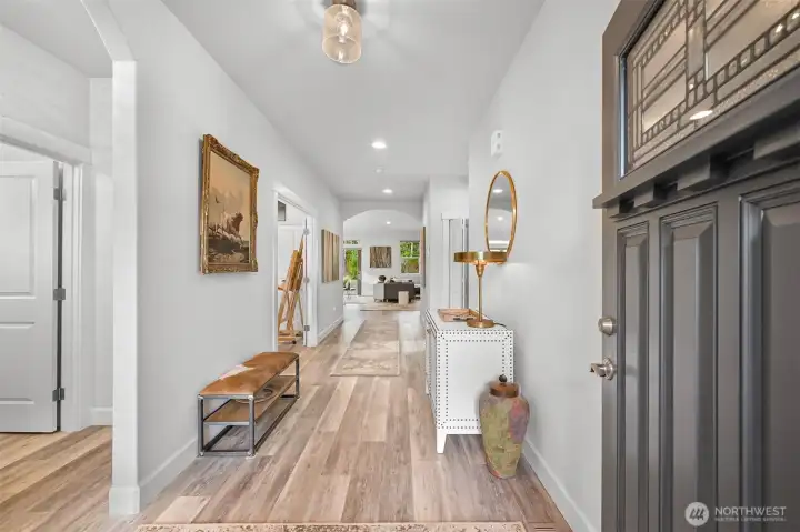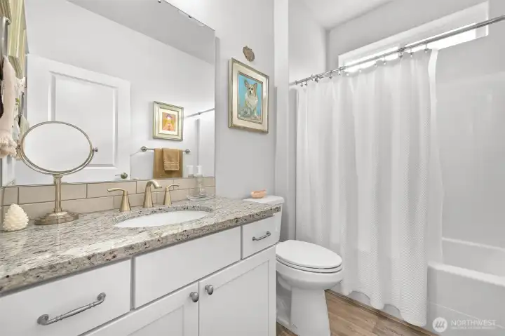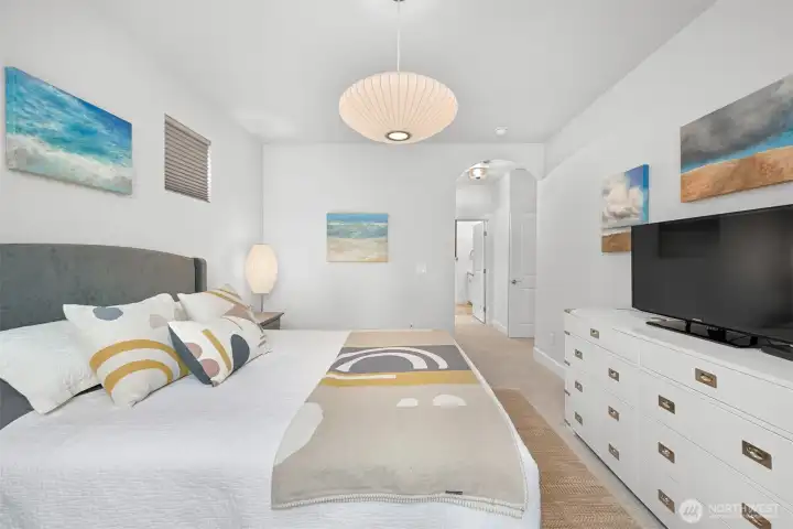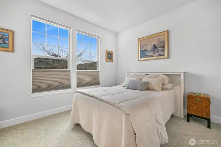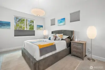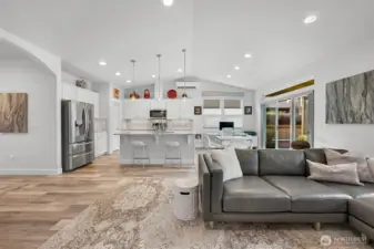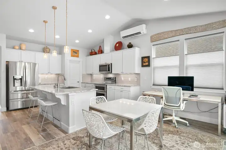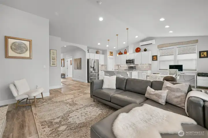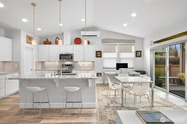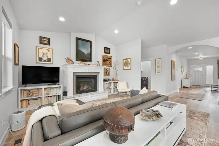 Nestled in the sought-after Woods Point 55+ gated community, this stunning one-level home offers comfort, privacy and convenience just minutes from Bellingham’s shopping, dining, entertainment, and medical facilities. Close to charming Ferndale and I-5 for easy travel, this community boasts many amenities, including a stylish clubhouse, scenic walking trails and a pickleball court and covered patio. Perched on a premium lot with no rear neighbors, the west-facing fenced backyard is a serene retreat with lush lawns, gardens, and tranquil greenspace views—all with landscape maintenance included. An expansive covered patio complete with a gas fireplace is perfect for year-round relaxation and entertaining. This outdoor haven seamlessly connects to the dining space by a large slider; multiple windows flood the area with natural light and fresh air. A no-step entry connects to an impressive open-concept layout, replete with natural light, vaulted ceilings and luxury vinyl plank floors. The great room features a gas fireplace and flows into a gourmet kitchen with white cabinetry, quartz countertops, a large island and a pantry. The split-bedroom design offers privacy with a primary suite showcasing a spa-like tiled shower, double vanity, walk-in closet and separate water closet. Extras include motorized shades, a heat pump with A/C and a spacious laundry room. With sidewalks, streetlights, and a welcoming neighborhood vibe, this exceptional home affords serenity, comfort and charm.