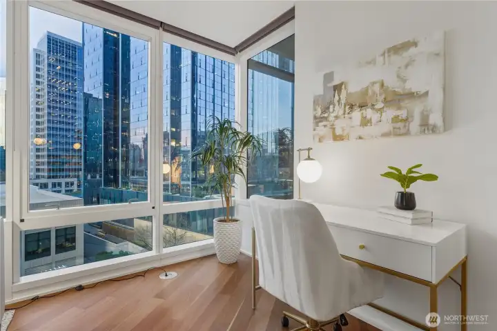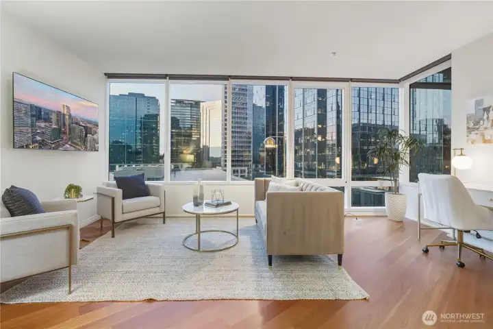 Live at the crossroads of convenience and luxury in Bellevue Towers. This refined 1-bedroom, 1.5-bath residence offers the ultimate urban lifestyle—whether you're a tech professional seeking a work-from-anywhere sanctuary or ready to embrace maintenance-free living that puts experiences first. Floor-to-ceiling windows and 9-foot ceilings create an airy, light-filled space with striking city views. Hardwood floors flow throughout, leading to a chef's kitchen with premium appliances, custom cabinetry, and an open layout that transitions seamlessly to your living area. An oversized primary suite provides tranquil retreat with spa-caliber bath. Your private balcony extends living space outdoors. Amenities transform daily routines into elevated experiences: 24/7 concierge service, resort-style fitness center, whirlpool spa, sauna, private screening room, dog park, and rejuvenating outdoor terraces. Secure parking. Outside, Bellevue's finest surrounds you. Walk to Amazon and Microsoft. Explore Bellevue Square's 200+ shops and award-winning restaurants—from casual pho to Michelin-worthy dining. Stroll Bellevue Downtown Park's fountains and gardens. Catch performances at Meydenbauer Theatre. Access light rail and buses. This is intentional living: less time maintaining, commuting, and planning—more time for what matters. Whether climbing the career ladder or enjoying well-deserved freedom, Bellevue Towers delivers the lifestyle you're looking for.