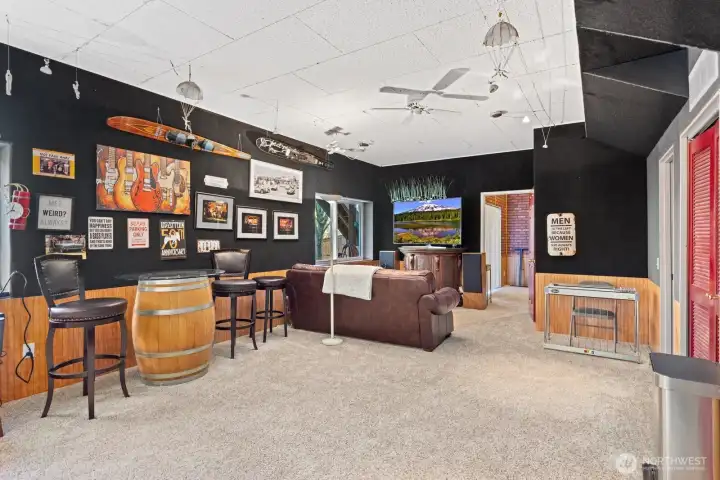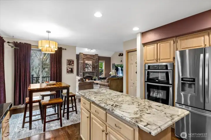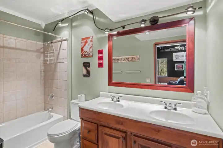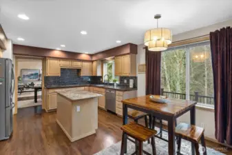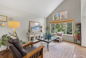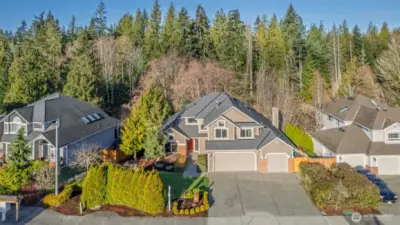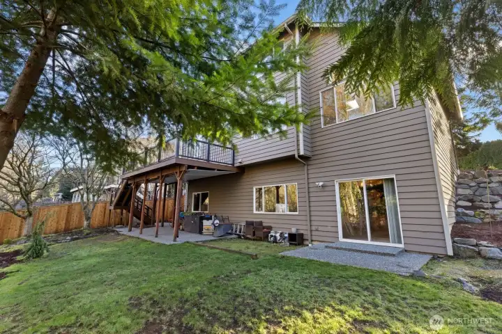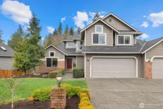 Located in the highly sought-after Faire Harbour neighborhood, this beautifully designed home offers space, privacy, and timeless Northwest charm. Step inside to soaring ceilings and beautiful oak hardwood floors that flow throughout the main living spaces. The open kitchen connects seamlessly to the elegant family room with vaulted ceilings and a cozy brick fireplace, creating the perfect setting for everyday living and entertaining. Double doors lead to a brand-new Trex deck ($27,000) overlooking a peaceful greenbelt — ideal for private BBQs, morning coffee, or relaxing evenings surrounded by nature. The main floor also features a dedicated home office, plus formal living and dining rooms, offering both versatility and refined entertaining space. Upstairs you’ll find three bedrooms, highlighted by a spacious primary suite with a fully updated, spa-inspired bathroom and walk-in closet. The lower level boasts an expansive, fully soundproofed bonus room with tall ceilings — (currently used as a “House-Cover Band” practice room) perfect as a media room, creative space, or potential ADU. Room for two additional bedrooms or “Safe room” or wine cellar. A spacious three-car garage completes the package. Backed by tranquil greenbelt for ultimate privacy, this home has it all.