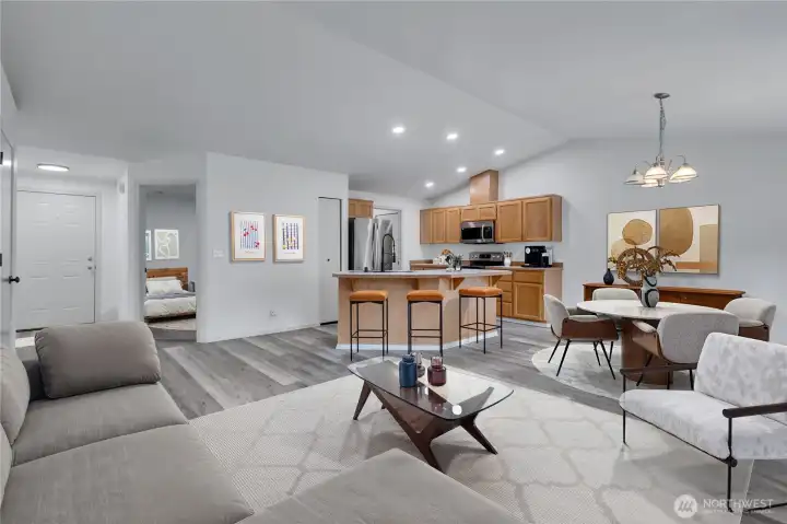 Nestled in the South Valley Estates community, this 3-bedroom, 2-bath home offers the perfect balance of comfort and convenience. Thoughtfully updated with new flooring, refreshed paint, and beautifully renovated bathrooms, the home is truly turnkey and ready for its next owner. Step inside to an inviting layout where the living room, dining space, and kitchen connect effortlessly, creating a bright and functional setting ideal for both everyday living and entertaining. A cozy fireplace and forced air heating ensure year-round comfort. The primary bedroom holds ensuite bathroom. Outside, the 5,954 sq ft lot is designed for low-maintenance living, and the attached garage adds practical storage and parking. The HOA enhances ease of ownership by covering front yard landscaping, water and sewer, as well as roof and road maintenance. Please note: select photos of the living room, dining area, and primary bedroom have been virtually staged.