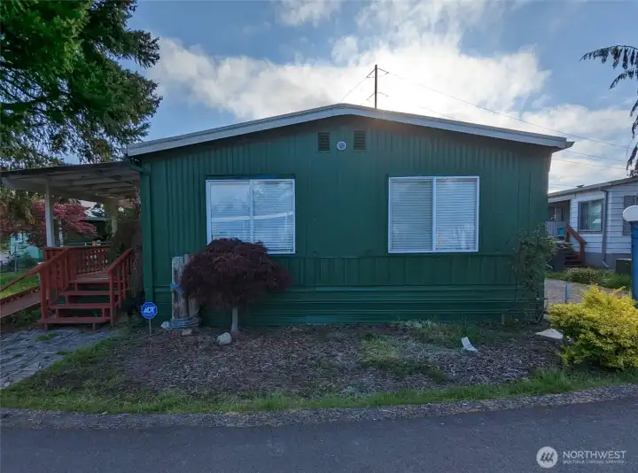 This spacious 1,152sqft doublewide has 2 bedrooms 1.75 bathrooms has newer paint inside and out with a possible 3rd bedroom or use as den/office space. Detached garage, sheds for storage and work room. Deck has ramp, stairs, and awning with plenty of sitting area. Covered parking. Nice sized yard for gardening, dogs and is almost entirely fenced accept by ramp. Close to shopping, schools, and restaurants. Pets ok but verify with park manager.