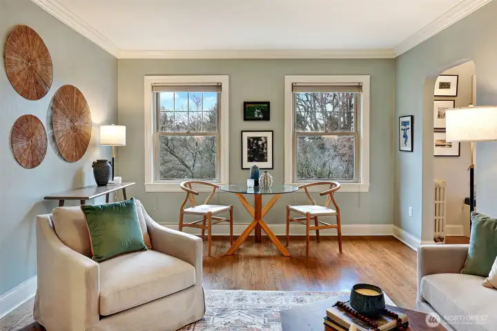 Historic Park Vista || This Craftsman-era co-op is in the most beautiful setting across from Cowen and Ravenna Park. A classic west-facing unit features high ceilings, abundant natural light, and serene garden outlooks. Thoughtful updates include a refreshed kitchen including appliances, fresh interior paint, tiled bath, and classic oak floors. An engaged, welcoming ownership community enhances the co-op experience. Elevator access for convenience. HOA dues include heat, water, sewer, garbage, earthquake, building insurance, and property taxes. Walk Score of 93. Both the Roosevelt and University District Link Stations are both extremely close-by. 5-star shopping at U-Village, or follow the Blvd to Green Lake to enjoy the outdoor amenities.