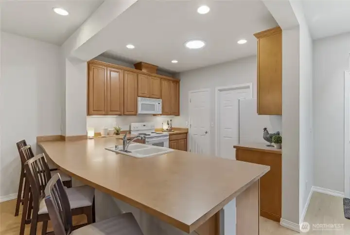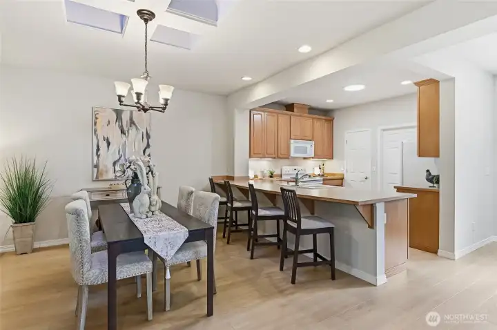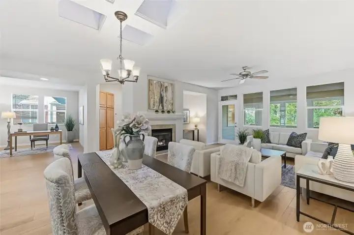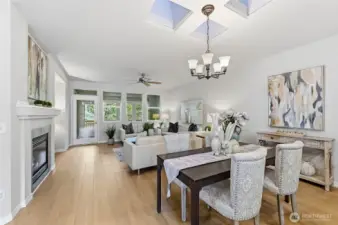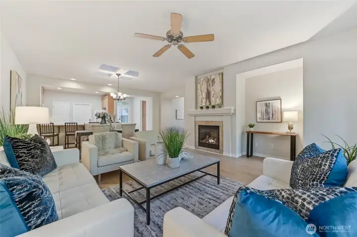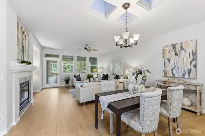 A golden opportunity awaits to enjoy year-round resort style living in this beautifully updated Union model home located in the “forever young” community of Trilogy. With new LVP flooring in the main living areas, high-end carpeting in both bedrooms and a freshly painted interior this home shines like new. The spacious peninsula kitchen includes lots of convenient bar seating, an abundance of cabinetry with handy pullouts and a large walk-in pantry. The focal point of the combined living and dining rooms is the cozy gas fireplace and media niche. Oversized primary bedroom with ensuite bath which features a step-in shower and a large walk-in closet with organizers. The second bedroom with an adjacent full bath creates a perfect guest suite for your long or short-term guests. The bedroom wings are separated by the home office providing everyone with plenty of privacy. The great room flows into the enclosed sunroom and expands your living area; this flexible space offers an array of possibilities. The superb outdoor space includes a large deck, a sunny flagstone patio and large side yard which can easily be fenced for your four-legged friends. Laundry room with storage includes W&D. Multiple skylights. 2 car garage w/storage. As the PNW’s premier 55+ master-planned community, Trilogy offers a resort lifestyle with a beautiful clubhouse, fitness center, indoor pool & walking track, pickleball, tennis courts, miles of walking trails and a true sense of community. 55+