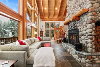 Classic Alpental chalet meets Mtn Craftsman Moose Lodge. Gaze up at Guye Peak framed in your windows as you warm up by the open fire radiating heat off the natural river rock. True chef's kitchen, timeless stone countertops that could have come from Alpental itself. Primary on the main level with custom fire place and cozy on-suite bath. Wrap around decks can be accessed from kitchen, great room and primary bedroom. Downstairs lower level can be multiple bedrooms with shared bath, or flex space/second living area with second primary bedroom. Open loft with it's own bath has plenty of space to be a bunk room, guest space along with third gathering area or game area. Large yard tastefully landscaped with firepit for warm summer nights.