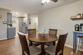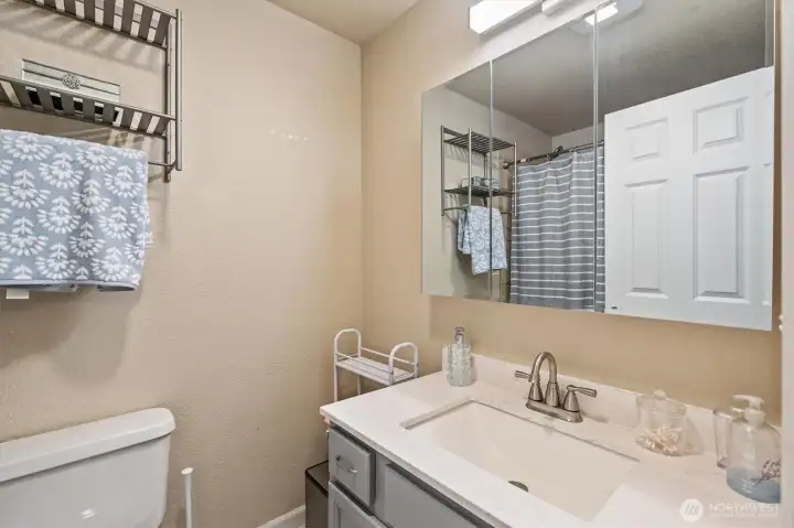 Welcome to the Holly gated community! This spacious top-floor condo features 2 bedrooms and 2 bathrooms, offering abundant storage throughout. The updated kitchen boasts sleek gray cabinetry, quartz countertops, and stainless steel appliances, all of which are included. Enjoy new laminate flooring in the dining room, along with a ceiling fan for added comfort. The living room seamlessly opens to a private patio with extra storage. Conveniently located near Boeing, Paine Field, a gym, and shopping centers. The gated entry provides one covered parking space, with plenty of guest parking along the interior fence line. A grassy area is also available for community enjoyment.