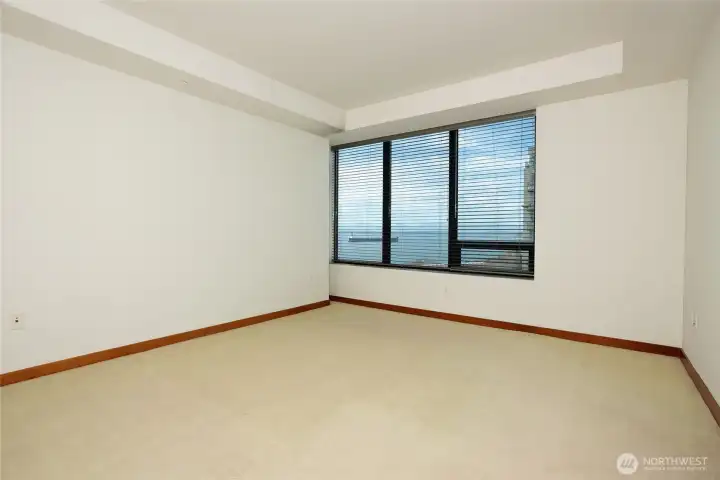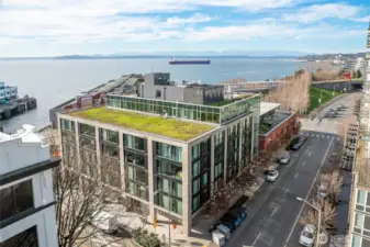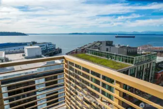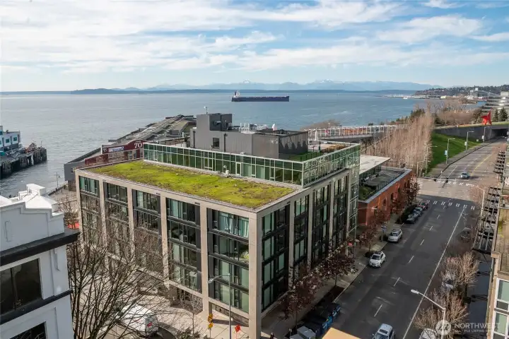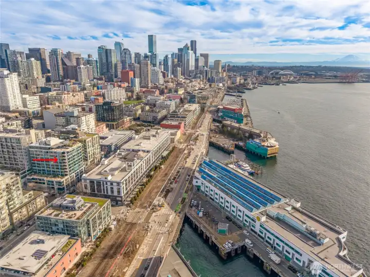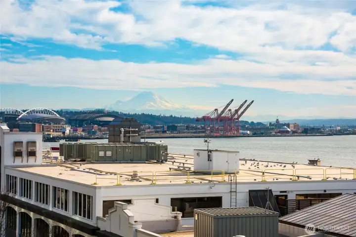 Stunning 180 degree views of Puget Sound, Mt. Rainer & the Olympics. Tons of natual light from floor to ceiling windows. Spacious layout with gas fireplace. Primary suite with en suite 5 piece bath and walk in closet. Updated appliances. Corner unit with deck. 2 parking spaces in common garage and a storage unit. Convenient location, just a block to the Olympic sculpture paek and the waterfront. Just minutes from the Space Needle and Pike Place Market. Amenities include concierge, gym, common roof deck. No rental cap.