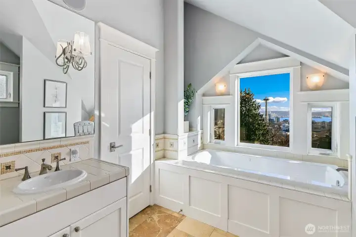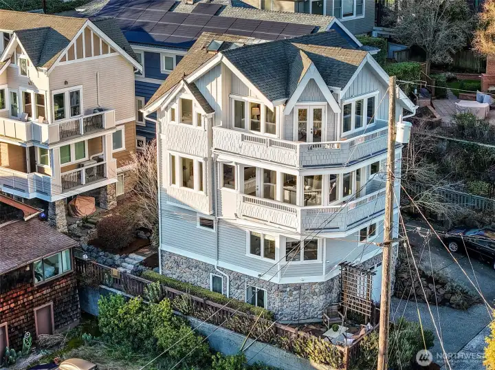 Incredible city and water views from a quiet street on top of Queen Anne. South-facing windows showcase a Frasier style view of the Space Needle, Cascades, Elliott Bay, Downtown Seattle, and Lake Union. Spacious rooms live gracefully: Cozy up to the fireplace or gaze at the view from the large living room with open dining room and kitchen with Viking appliances (plus BBQ deck); Relax in the top-floor primary suite with view deck, soaking tub, separate shower, dual vanity and large walk-in closet. Enjoy having 3 more bedrooms close to each other on the main floor and lower level. Throughout the home, cohesive craftsman quality finishes with real materials; true wood floors and siding, gas fireplace, oversized windows, and slate-entry floors. One car garage and driveway parking give options for parking and storage. Easy low maintenance landscaping is gorgeous with all-season blooms and trees from the front approach and ground-floor terrace. Excellent property position is set back from the street for privacy and discrete living, plus within blocks there are amazing Seattle amenities; the scenic Queen Anne Boulevard walk, Trader Joe's, Met Market, many restaurants and shops, and of course Seattle Center/Climate Pledge Arena and South Lake Union. This easy contemporary view house is a perfect place to call home.