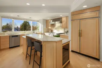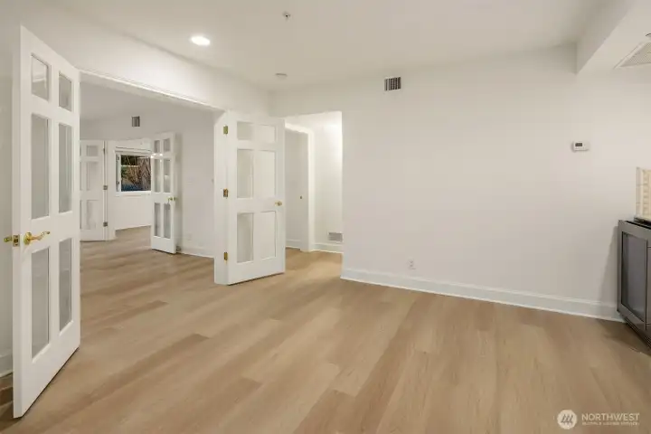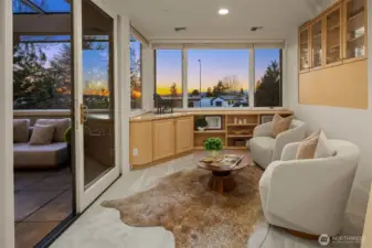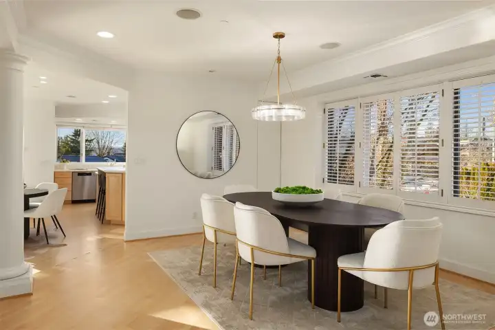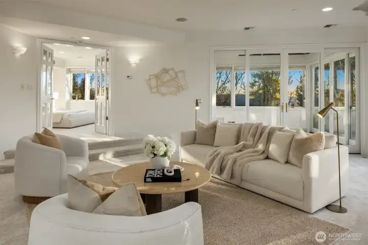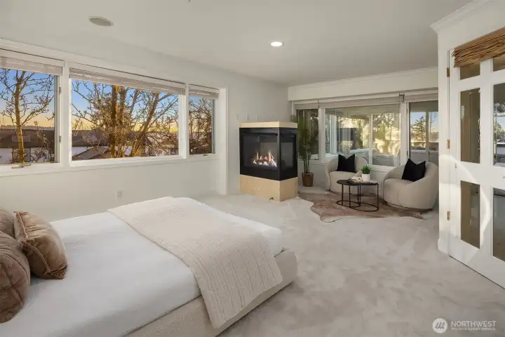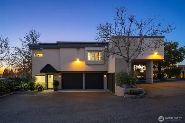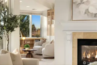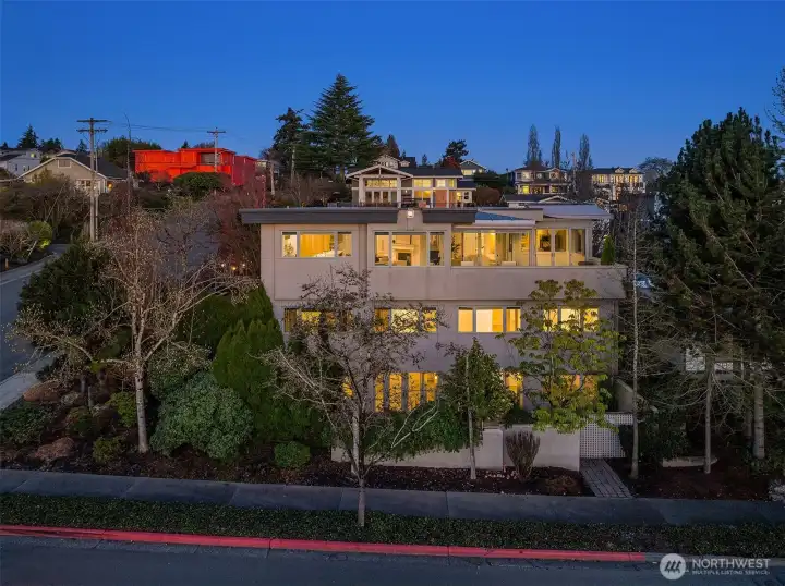 Functioning as one of the Eastside’s only true live-and-work buildings, this Market Street address is purpose-built in Downtown Kirkland. Designed for an owner seeking both residential luxury and professional functionality, the property offers rare flexibility without compromise. The top-floor penthouse residence makes a lasting first impression. A sculptural entry unfolds beneath a soaring curved ceiling, illuminated by natural light. A sweeping staircase traces the wall above layered stone flooring, setting the tone for what follows. Spanning three versatile levels to suit a dual purpose owner, the home is finished in hardwood and surrounded by expansive windows capturing Market Street outlooks. The living room is set by architectural pillars and a statement fireplace, while the sky deck opens to panoramic views of Lake Washington. The primary suite features a sitting area, fireplace, and refined five-piece spa bath. A private office completes the penthouse level. Each floor has a secure entrance, allowing separation of residential and professional use. The professional space begins with a formal hallway for private clients from the parking area into a reception area, 4 private offices & a boardroom. The ground level has four ensuite bedrooms and plumbing in place for a second full kitchen. Offering over 7,000 square feet of scale, this is an offering rarely seen in Kirkland.