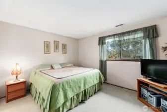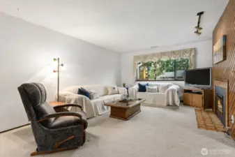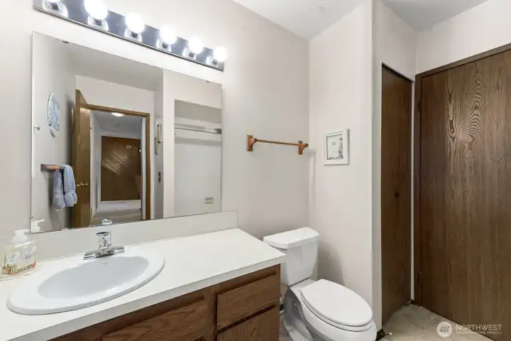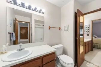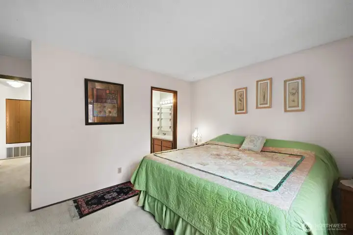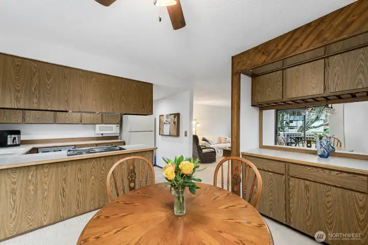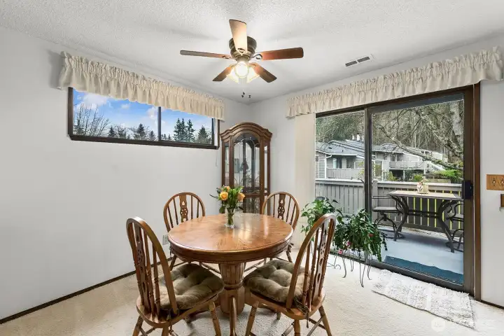Immaculate and extremely well cared for. Neutral with freshly painted white walls and light carpeting. Lives large! Open, light and bright with big living room open to oversized dining and direct access to private deck. Extra large primary vanity area with sink and walk in closet, plus direct connection to full hall bath makes the floorplan efficient and multi-functional with private bath access from both bedrooms and dual vanities. Large, sun-drenched deck overlooks the beautifully landscaped and manicured greenspace within the complex. Top floor, end unit ensures quiet privacy. Walk to shopping and restaurants, close to Juanita Beach Park (with seasonal Farmer's Market) and convenient to Totem Lake Village and downtown Kirkland. Quiet complex, well landscaped area surrounds you with green space yet centrally located close to everything.