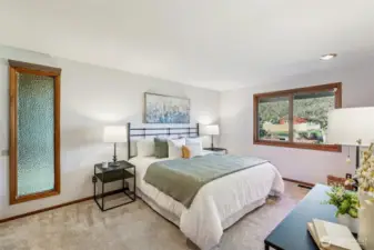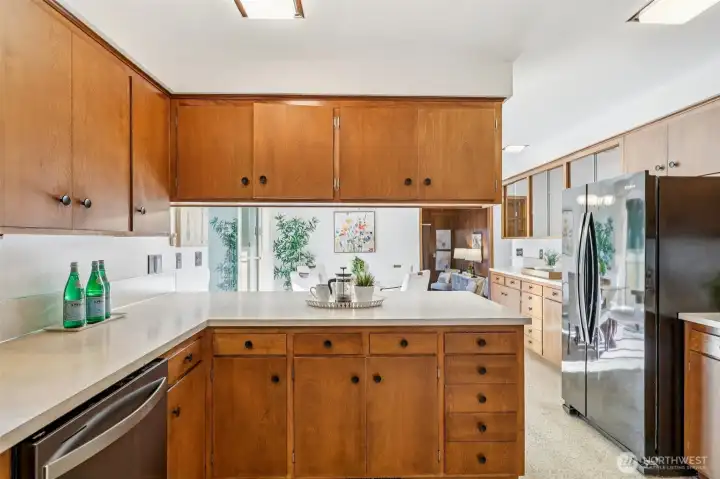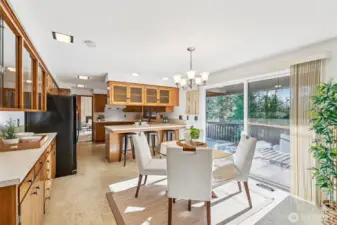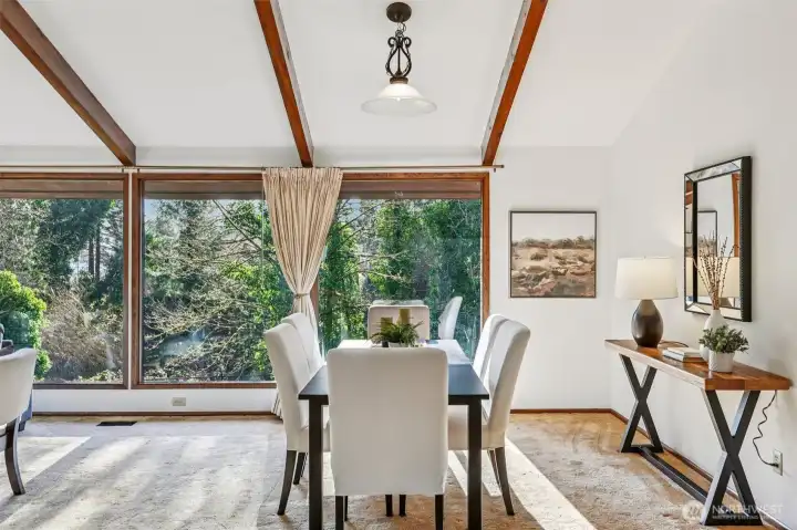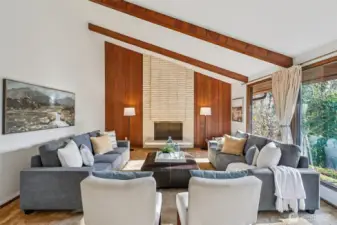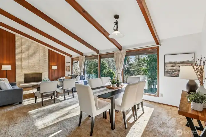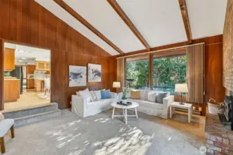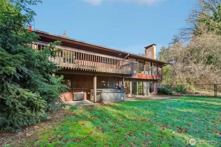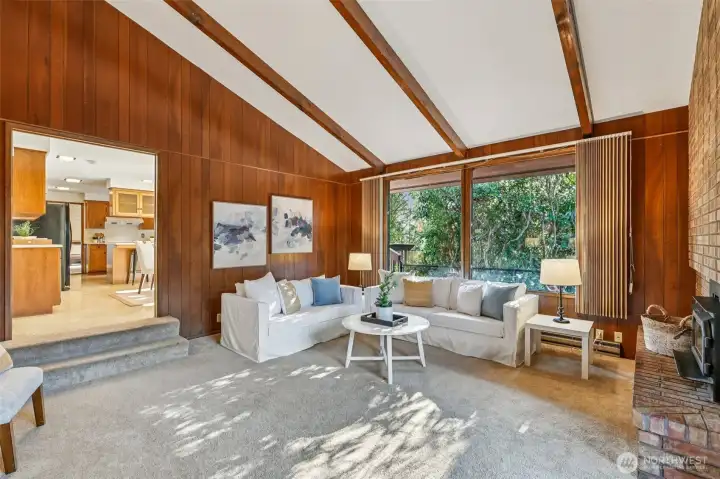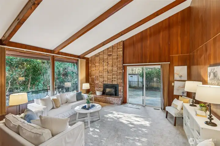 Beautifully designed courtyard entry introduces this light filled home through a stone foyer, opening into a spacious living room with vaulted ceilings and a stunning wall of windows. Over 4500 square feet, 6 bedrooms, 4 on the main floor.The kitchen offers a large wall cabinetry and a casual eating area, with sliding doors leading to an entertaining large deck for classic indoor outdoor living. The family room adds to the home’s architectural drama with vaulted ceilings, a striking floor-to-ceiling fireplace, and direct access to a private patio ideal for both gatherings and quiet retreats that make you feel like you are out of the city. Downstairs, a huge recreation room with wet bar provides flexible entertaining space, while the sauna adds a spa-like touch. With oversized rooms, this home celebrates space, light, and timeless mid-century appeal. You won't want to miss the opportunity to have all the space you could ever want!