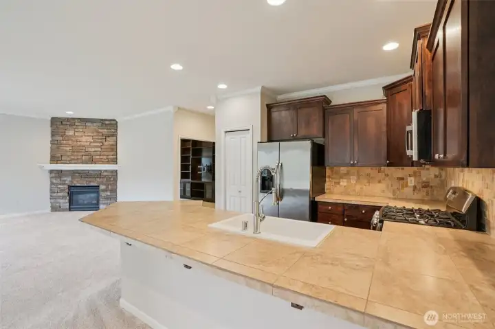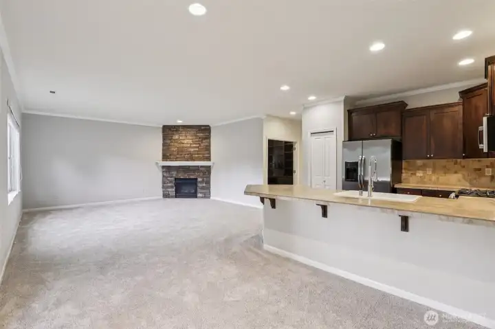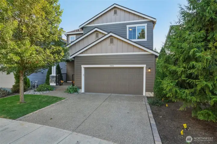 Tucked within a quiet community featuring private trails and pathways, this home backs to four acres of Belmont NW HOA green space, offering privacy and a natural backdrop of mature trees and hillside views. The backyard is designed for gathering, with stone pavers and a custom gas firepit overlooking the open space beyond. Recent updates include fresh interior paint and new carpet throughout. The main level offers 9-foot ceilings, a dedicated office or den with French doors and custom built-ins, and an open-concept kitchen with an eat-up peninsula that flows seamlessly into the dining area and family room with a stone fireplace. Upstairs, the spacious primary suite features a remodeled ensuite bath with a soaking tub and walk-in shower. Three additional bedrooms, a full bathroom, and a dedicated laundry room complete the second floor. A large covered front porch enhances the home’s curb appeal, while the garage includes built-in storage and a worktable area that will remain with the property. This well-maintained home offers thoughtful updates, functional spaces, and a setting that feels connected to nature.