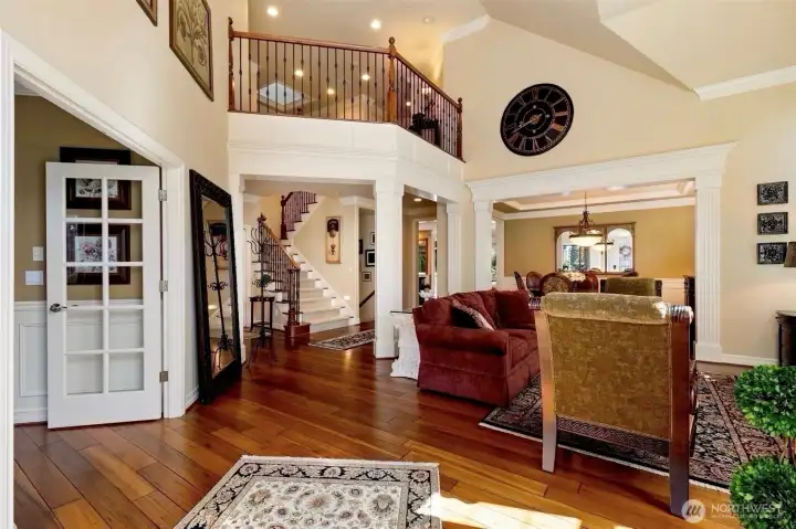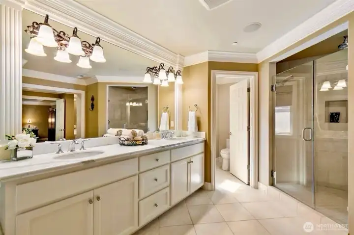 Timeless Buchan luxury in Mill Creek’s premier River Crossing. Private greenbelt cul-de-sac setting with 4,770?sq?ft features soaring ceilings, mahogany floors, exquisite millwork, & leaded glass accents. Gourmet kitchen offers a 48” Thermador, Sub-Zero Pro, Meile espresso, slab granite island with Brizo touch faucets, custom cabinetry. Versatile plan includes 5 BD, 4.5 BR, executive office, theater, & bonus room. Grand primary suite with a fireplace, spa bath, rain shower, and dual walk-in closets. Landscaped yard, tranquil triple fountain, expansive Trex deck, lighted sport court, & irrigation. Dual A/C, tankless water, integrated whole-home audio, and a finished 3-car garage. Lower-level MIL potential. Walk to Town Center, golf, & parks.