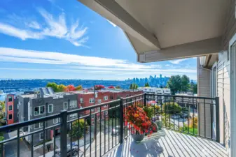 Prepare to be delighted by this top floor unit with cathedral ceilings, spectacular natural light & 180-degree views! This urban pied-a-terre has an updated kitchen with quartz counters, stainless appliances, & skylight. Meticulous hardwood floors, dining room, fireplace, & large deck. The views stretch from the Space Needle & across the city with glimpses of Mt. Rainier, over Lake Union, dotted with Cascade Mountain vistas all the way to Mt. Baker. Enjoy fireworks on New Years Eve & 4th of July. The big bedroom has plenty of room for a King-sized bed & desk/dresser, plus a walk-in closet. Storage & secured covered parking. Just a short stroll (nearly flat!) to top of Queen Anne shopping, restaurants, bars. Enjoy the rare combination of a very well-funded & managed building with affordable dues! No assessments! Priced well below assessed value for quick sale! Don't wait!