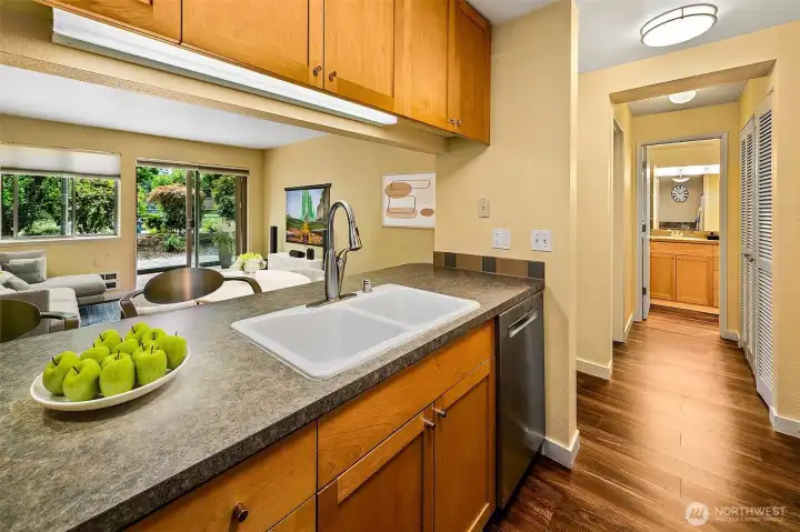 A hidden retreat, this off-street garden unit offers unmatched serenity in a prime urban setting. This south-facing gem features natural light and a freshly painted interior, a blank canvas just waiting for your personal touch. Near Seattle Center, you can embrace a walkable lifestyle or use the easy access to transit. The heart of Queen Anne is just a short stroll away, with easy access to shops and restaurants while still having dedicated parking. This is a pet-friendly building and elevates your experience with a gym, lounge, grilling area, EV charging and bike storage.